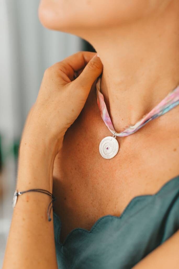 ⚬ Choice of recycled silk ribbon or silver chain.