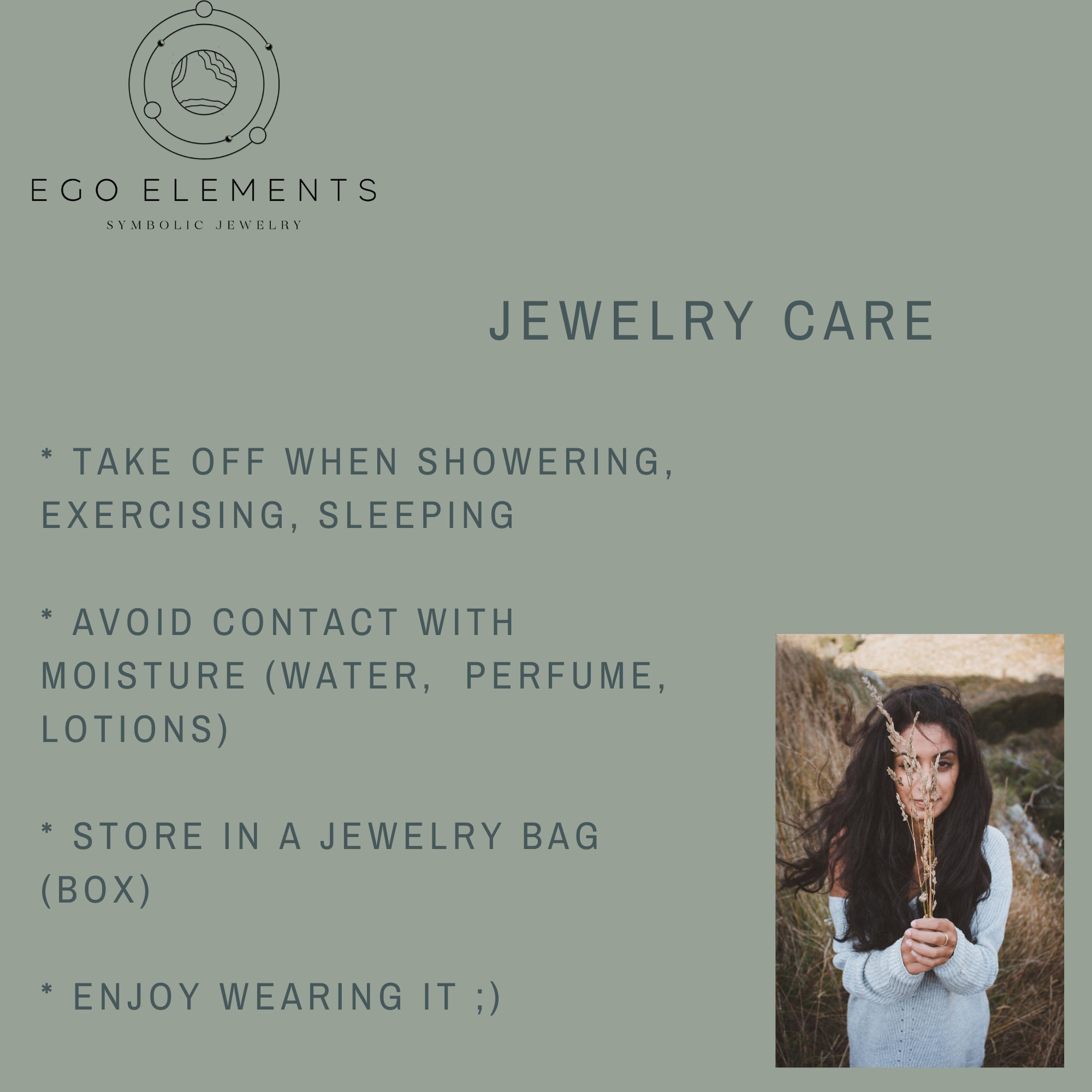 To keep your jewelry in the best condition please avoid the contact with moisture (water, perfumes, lotions) and store in a dry place. Please use the silver polishing cloth to maintain your jewelry in the best condition.