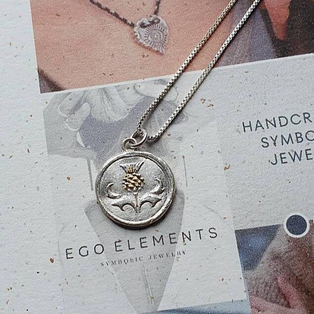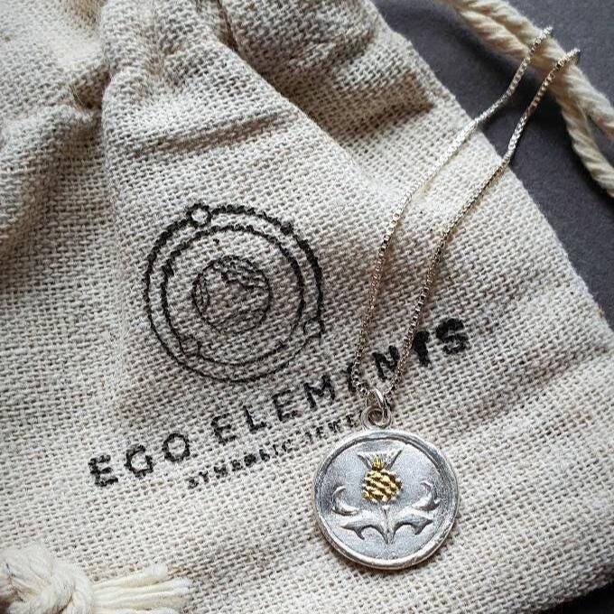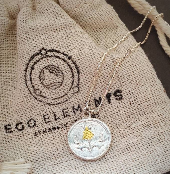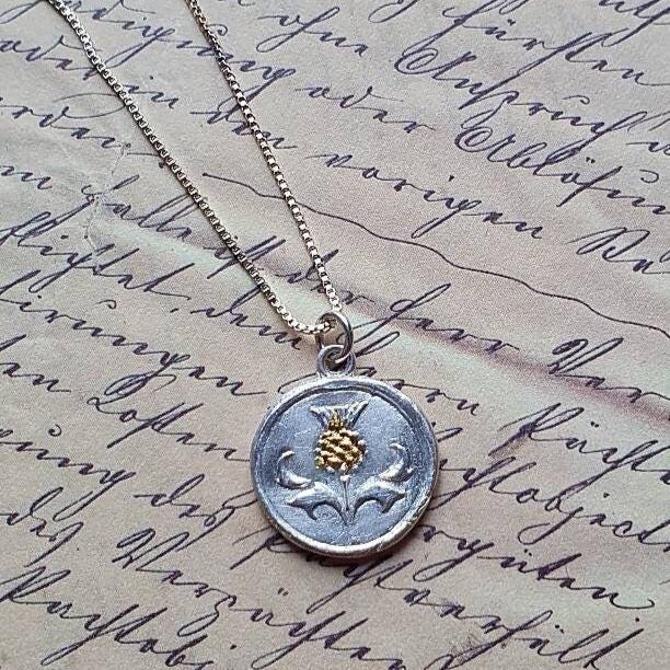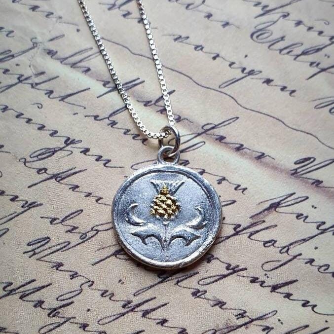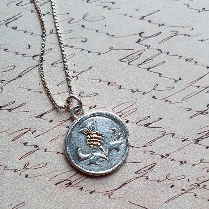 This wax seal Thistle pendant is handcrafted from solid fine silver with real gold accents.