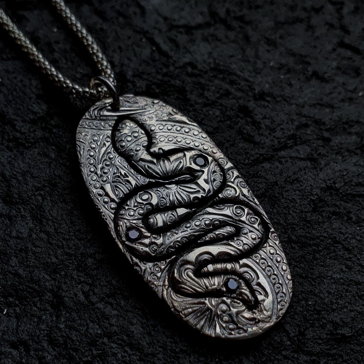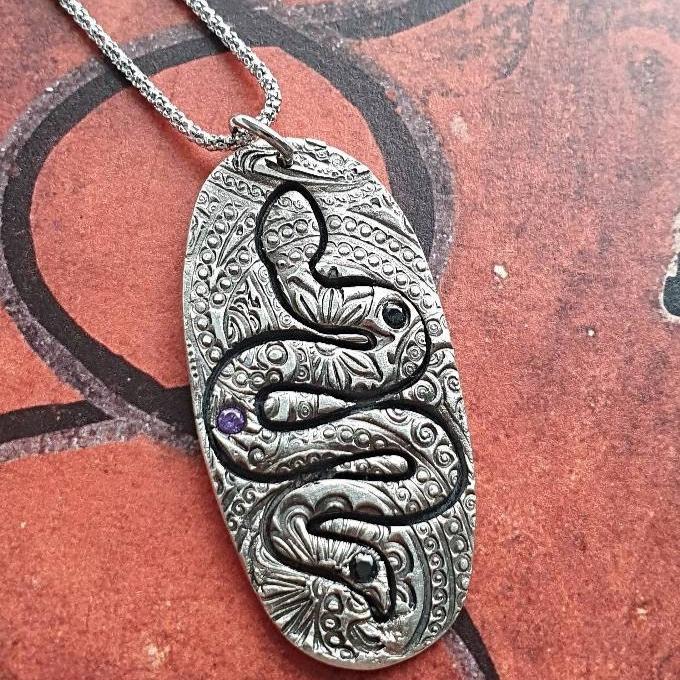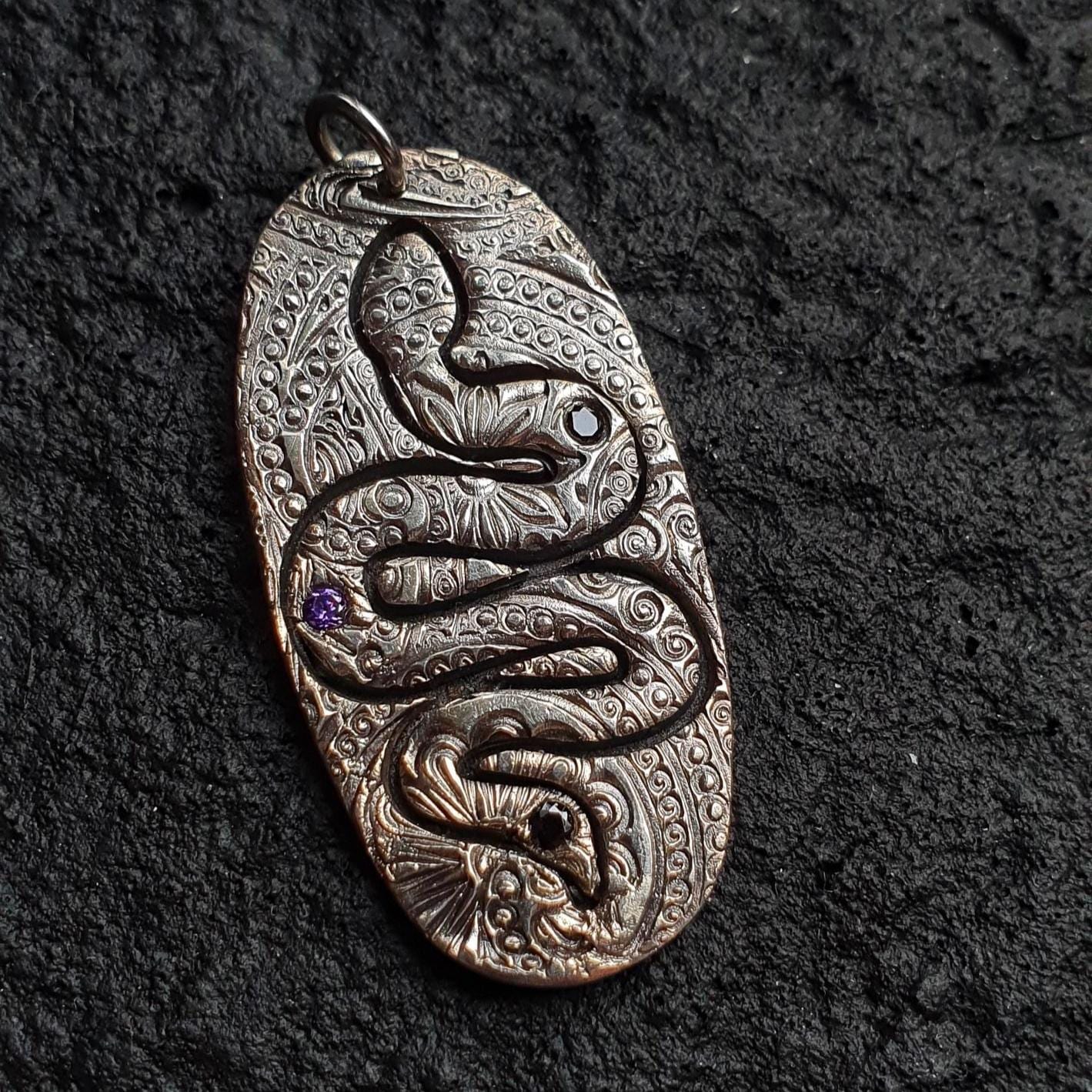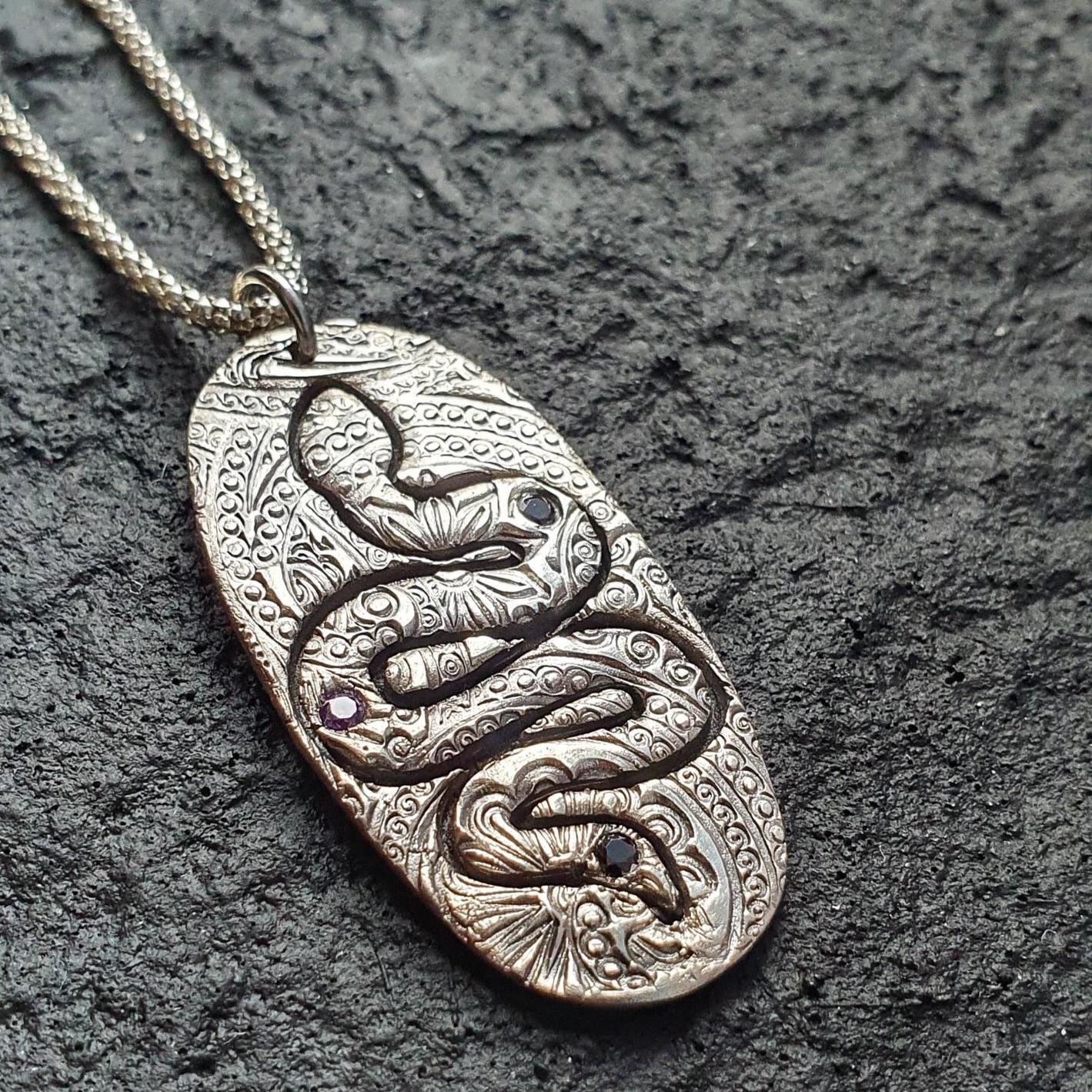 This witchy silver necklace features the snake pendant adorned with two Cubic Zirconia stones and a solid sterling silver chain.