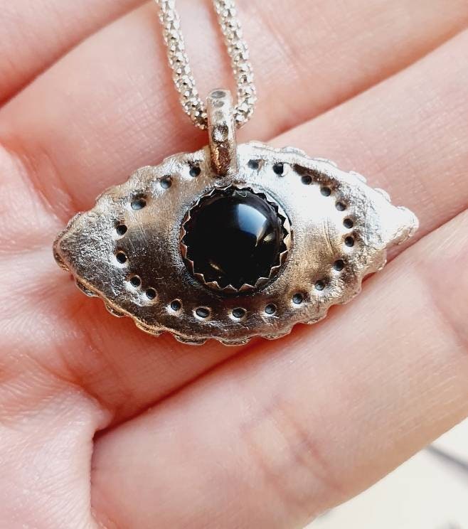 This protection Evil Eye Amulet features solid silver double sided pendant adorned with a black Onyx.