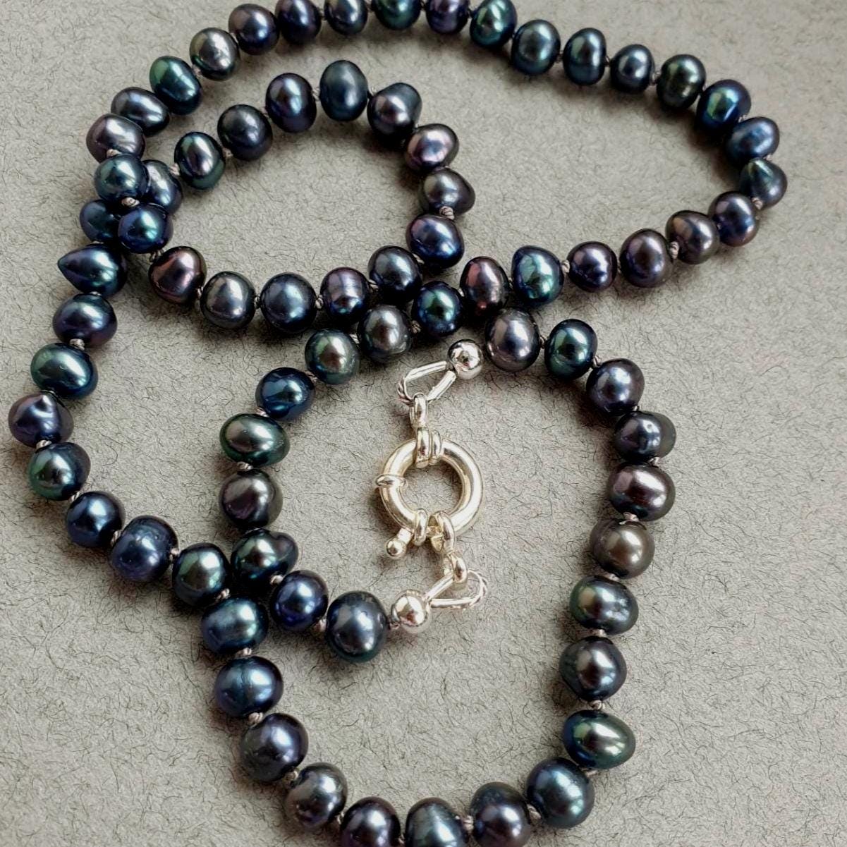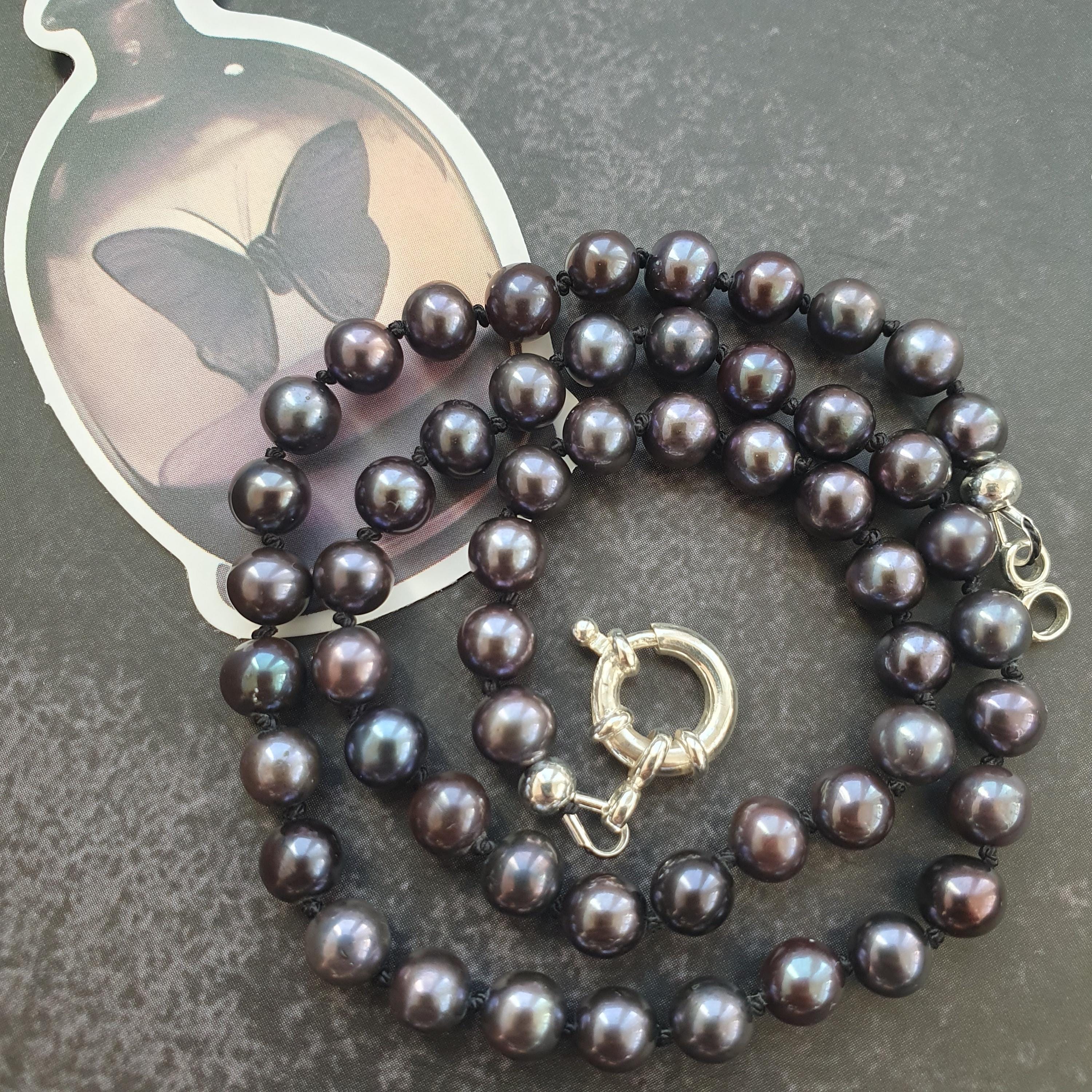 This beautiful hand-knotted necklace features freshwater black Pearls, natural silk thread and 925 sterling silver details.