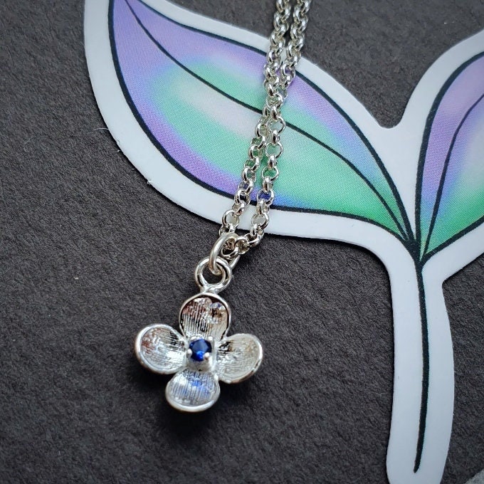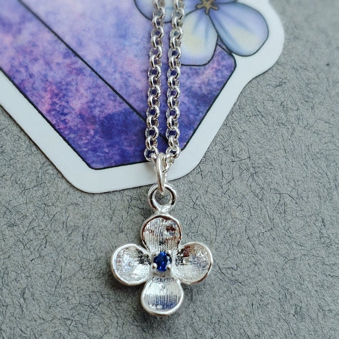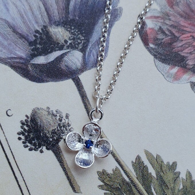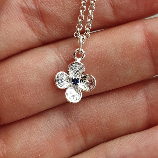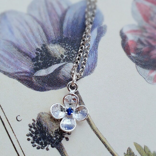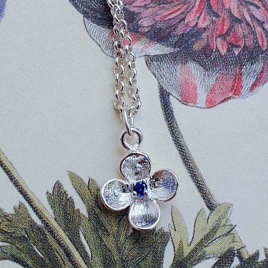 This delicate nature inspired necklace features tiny flower pendant adorned with blue Sapphire on a sterling silver chain.