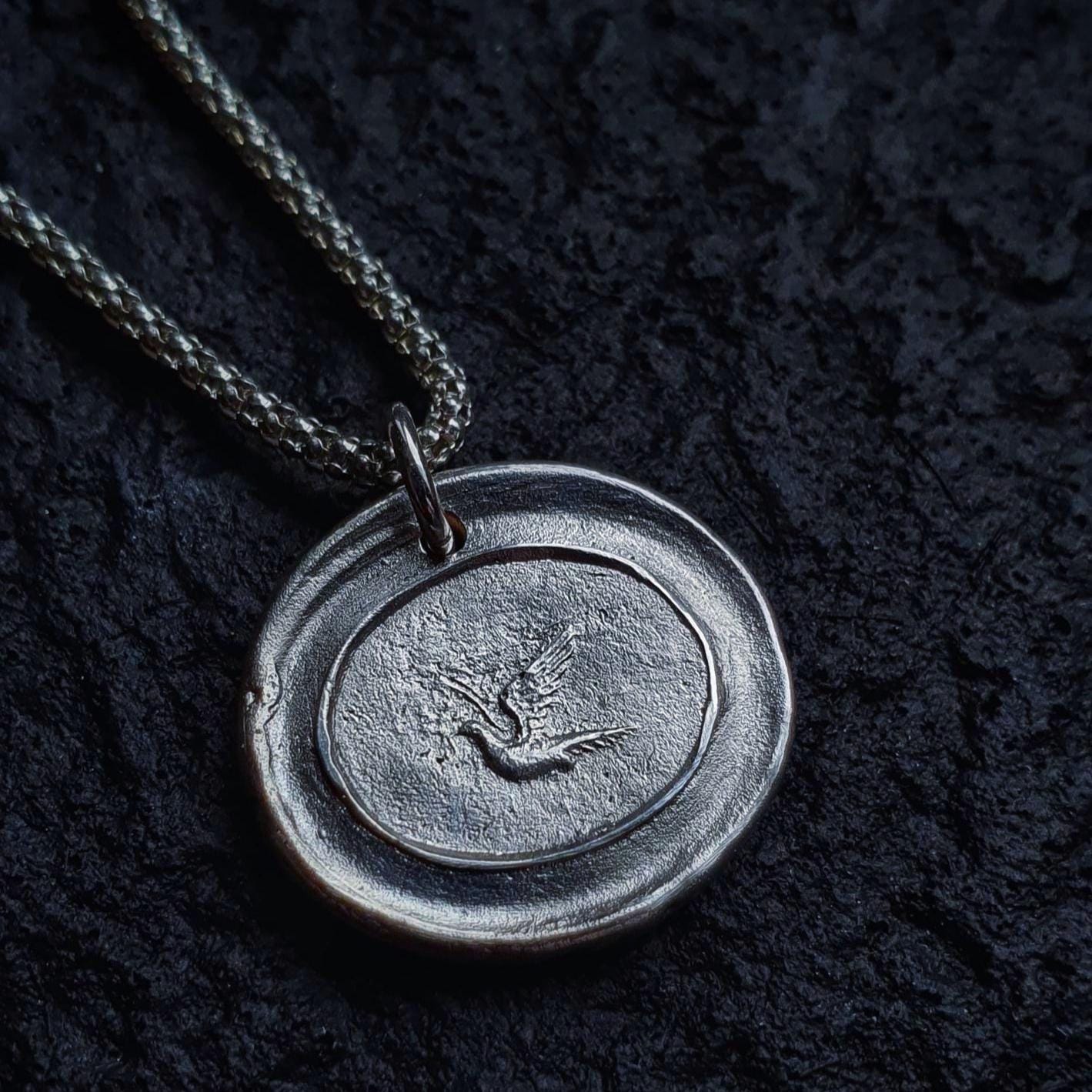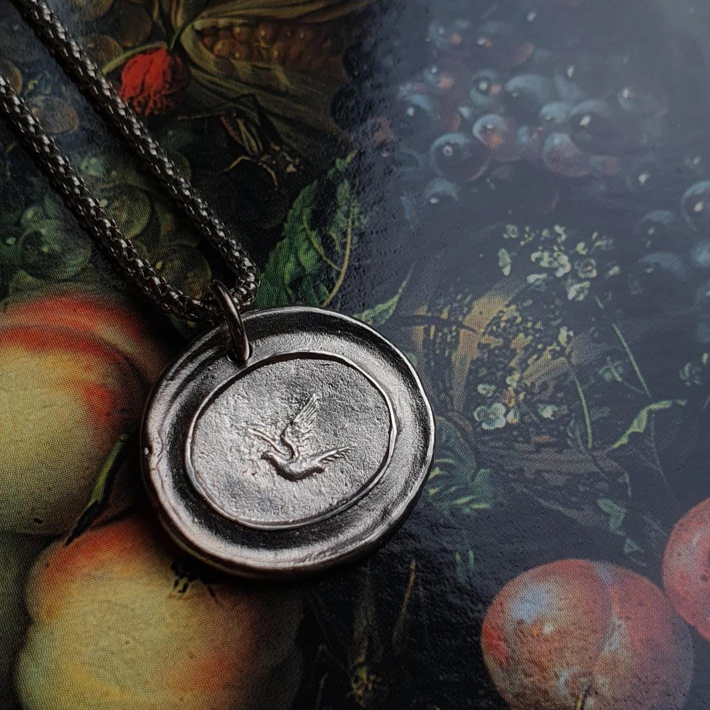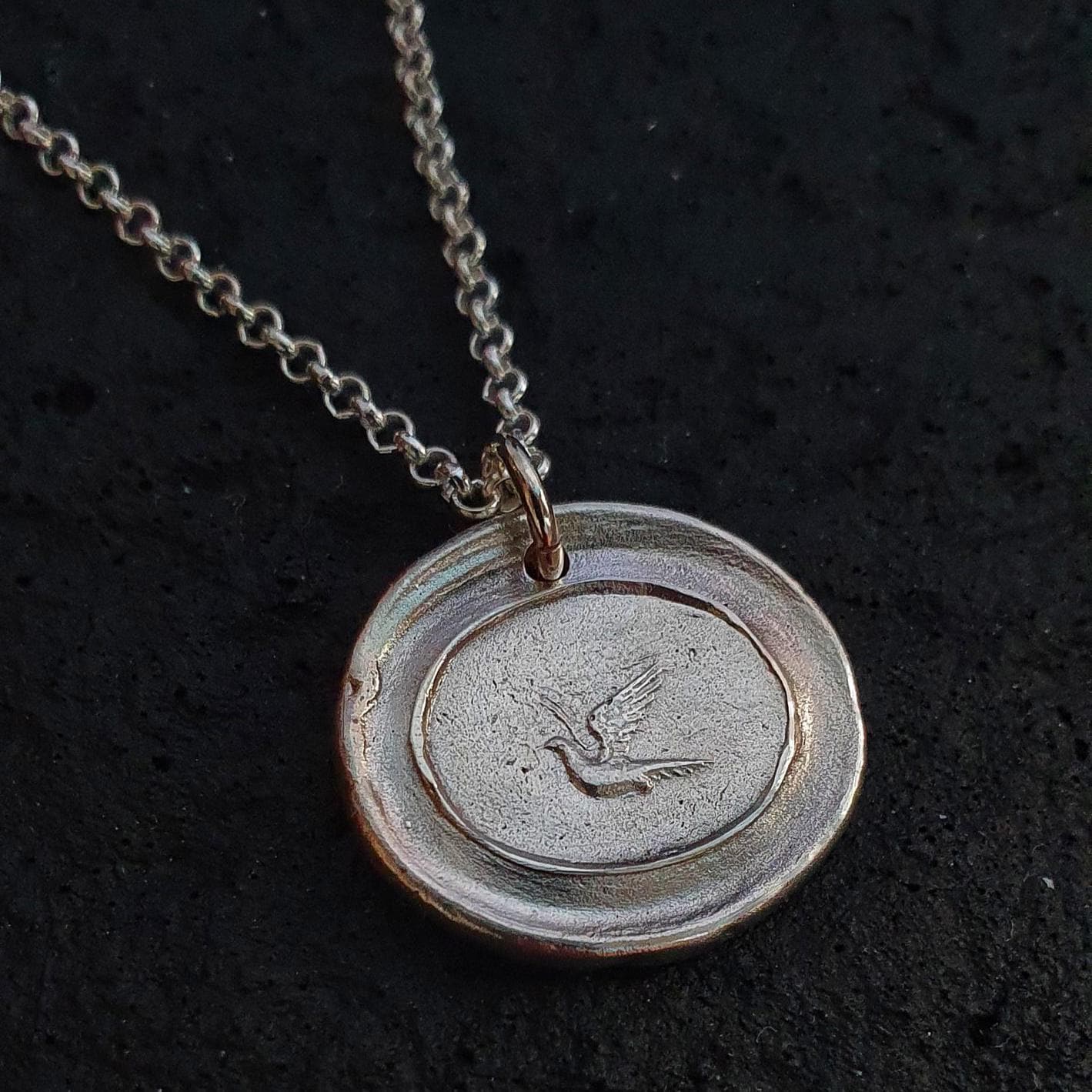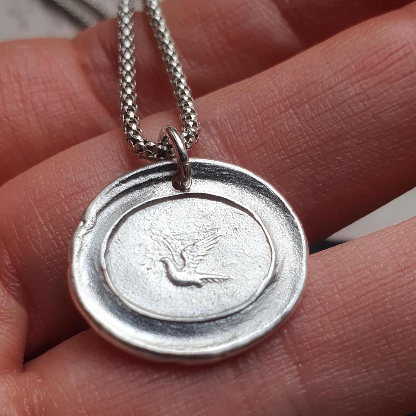 This solid silver bird pendant was made using an antique wax seal, which I found at a vintage Market in Milan.