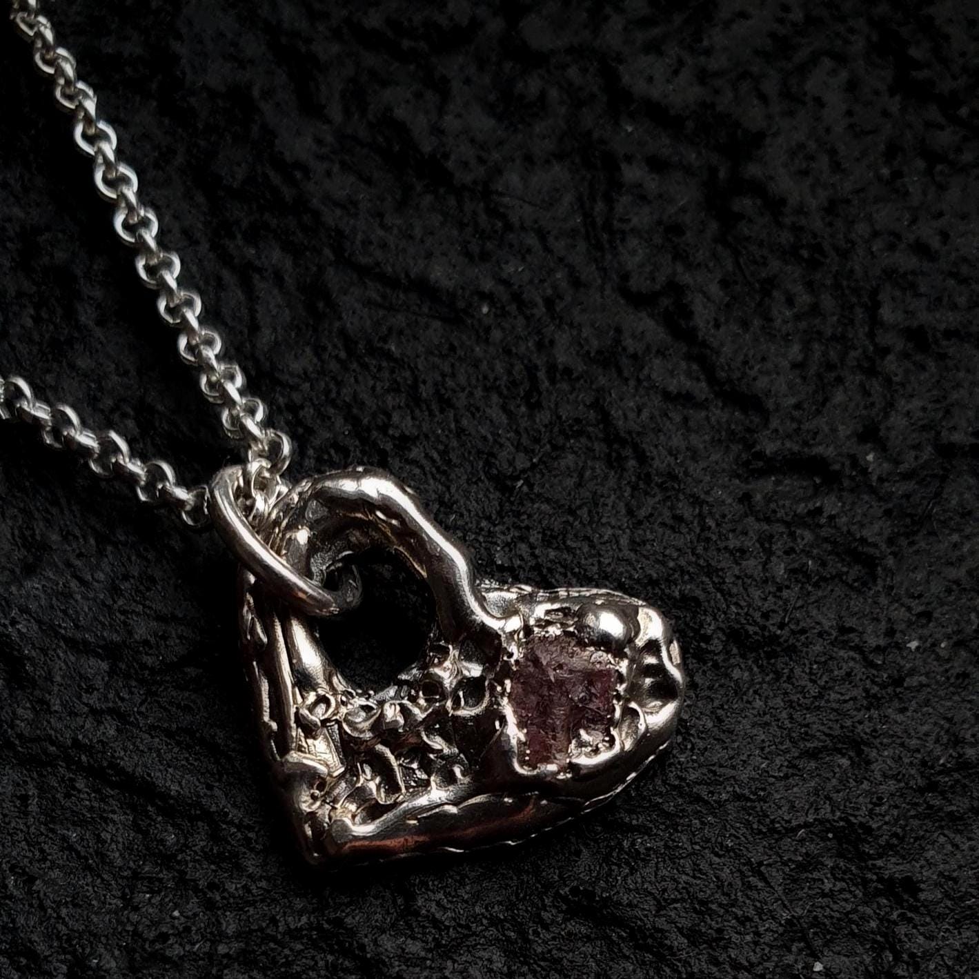 This molten heart-shaped pendant is made using antique lost wax process and features solid sterling silver and a natural raw Sapphire.