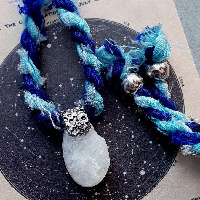 This celestial necklace features Raw Moonstone and 999.fine silver pendant on a recycled silk cord.