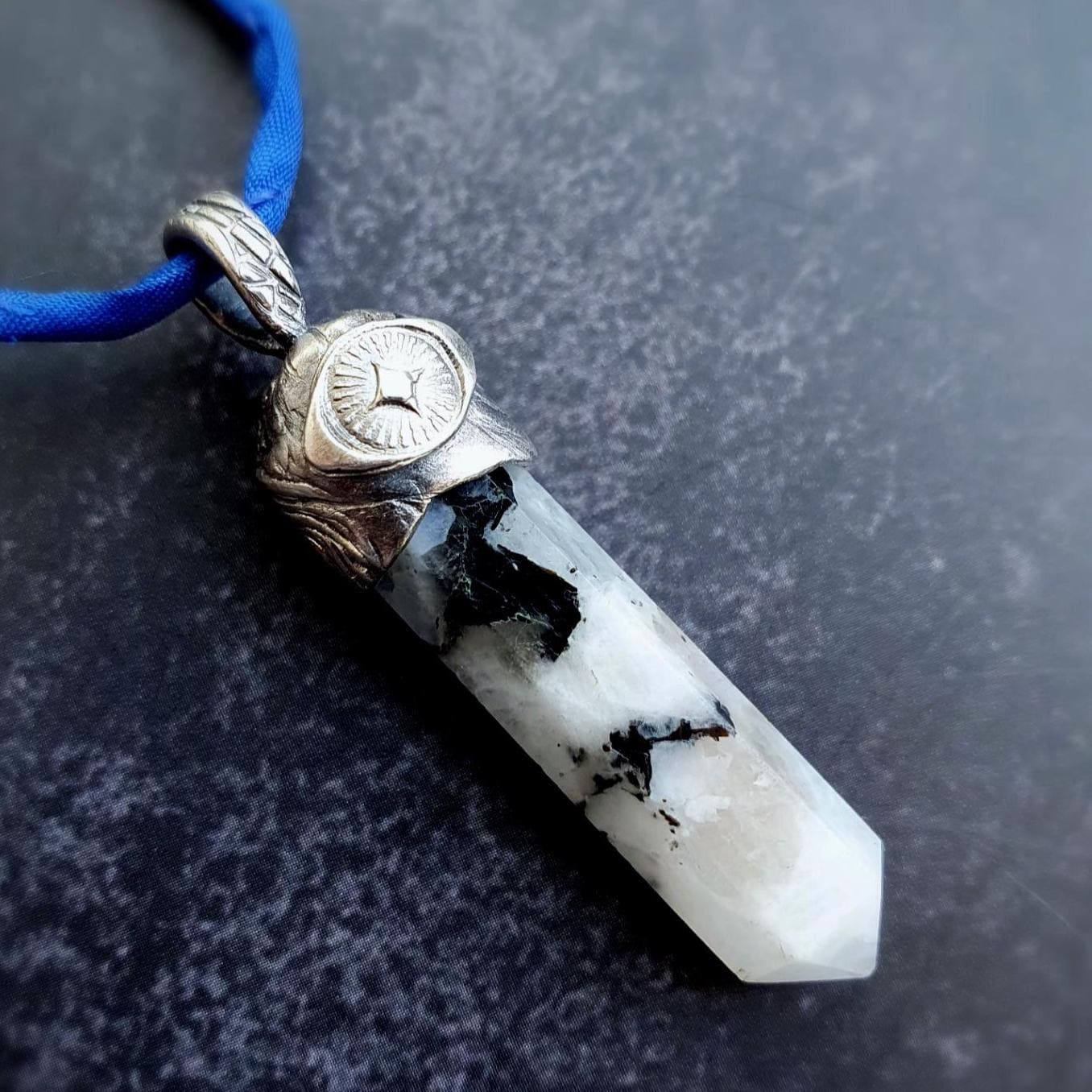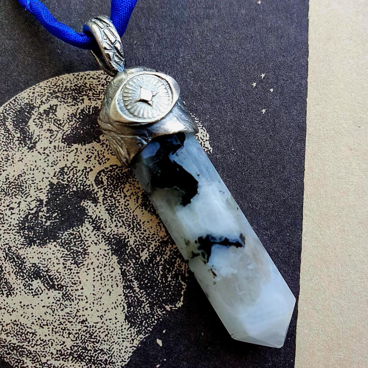 This beautiful and unique point necklace features Rainbow Moonstone, Evil Eye symbol and solid silver pendant.
