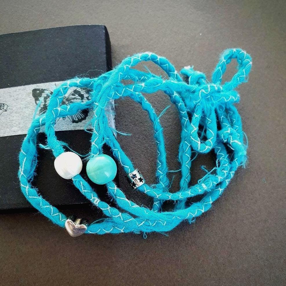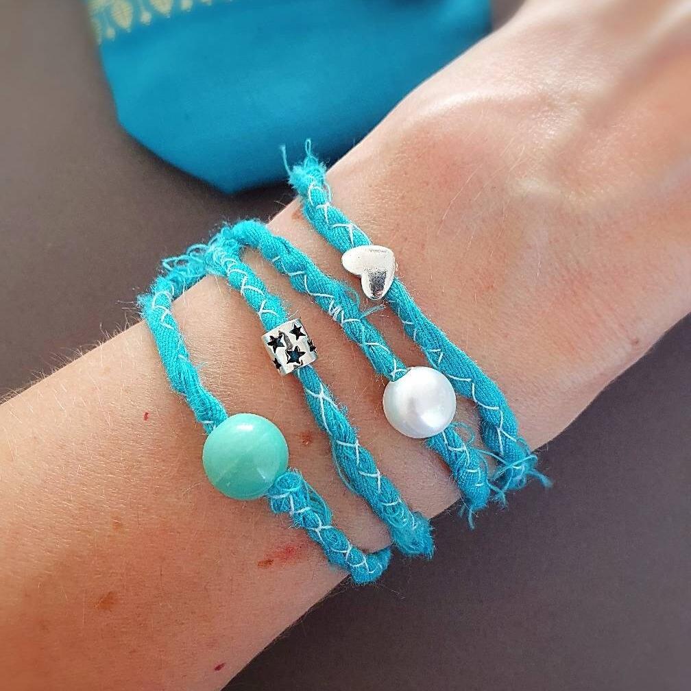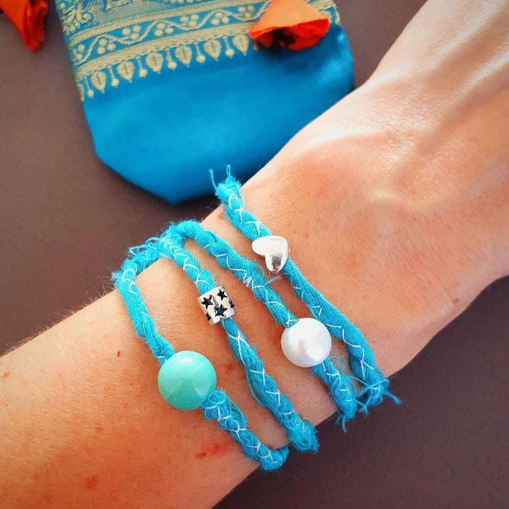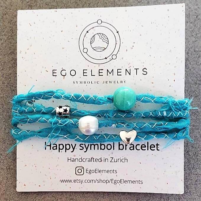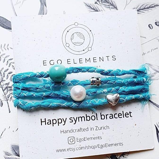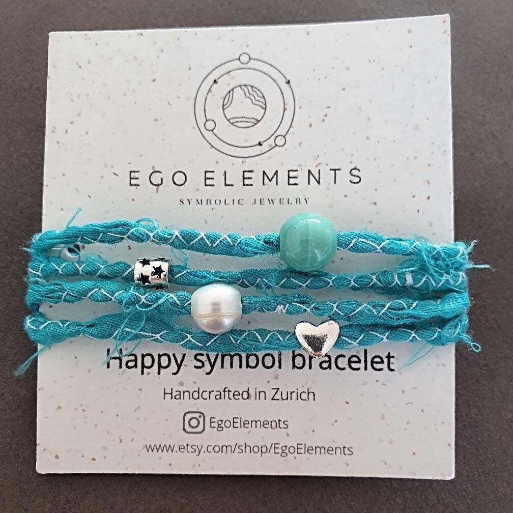 This summer boho bracelet features two 925 stetling silver charms (heart and star), one freshwater pearl, a beautiful ceramik bead and a hand-stitched ribbon.