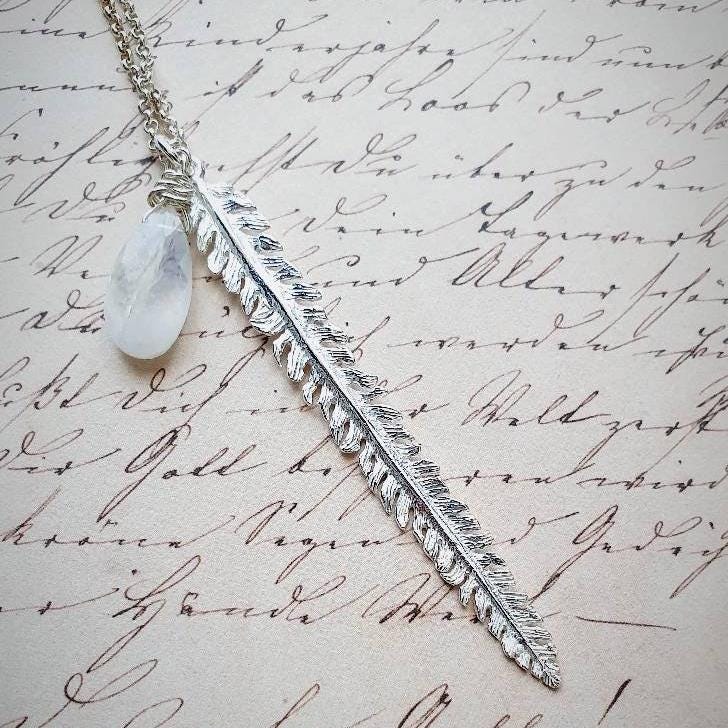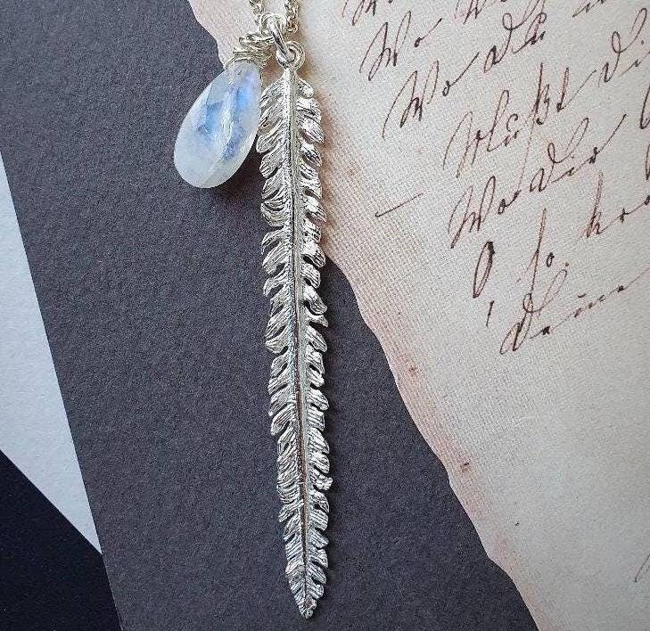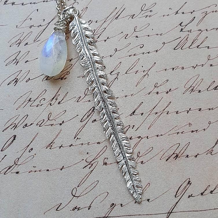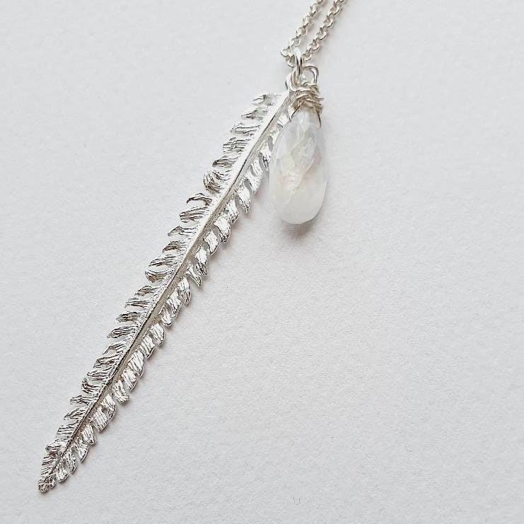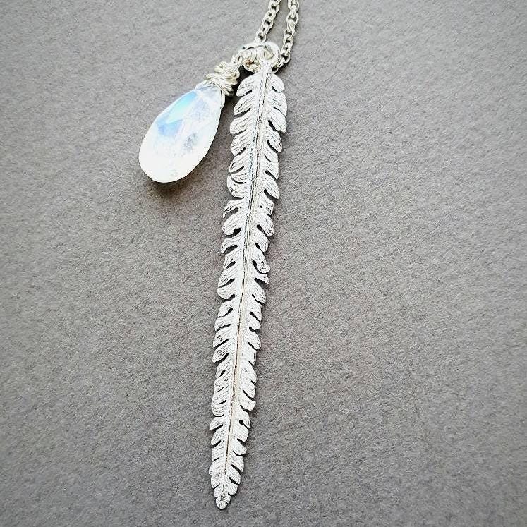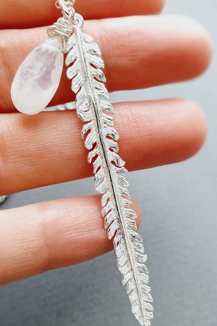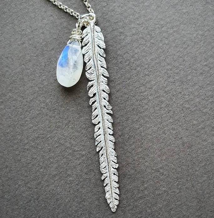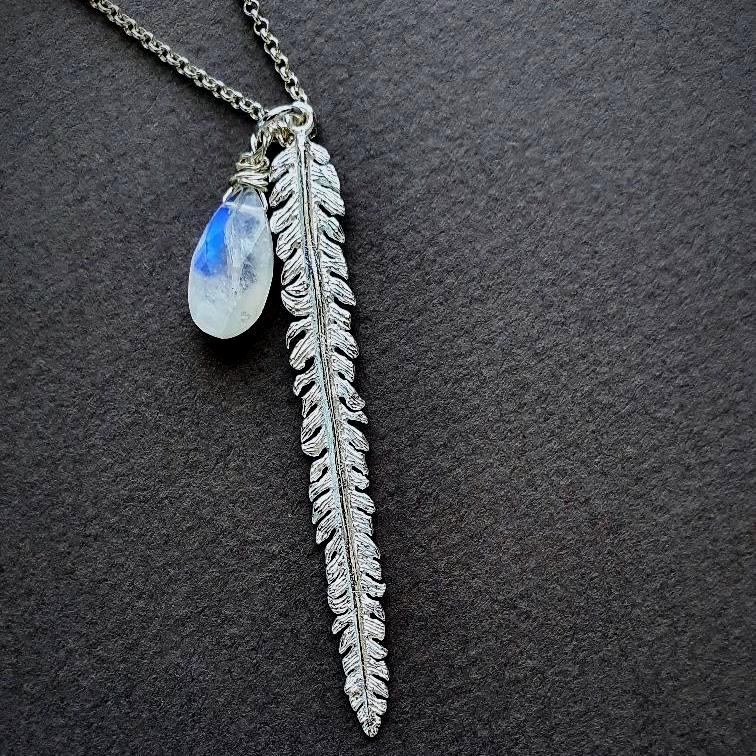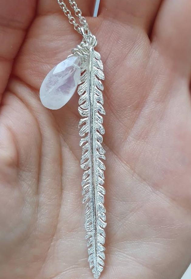 This beautiful crystal necklace features a Rainbow Moonstone and a Sterling Silver Fern Pendant on a silver chain.