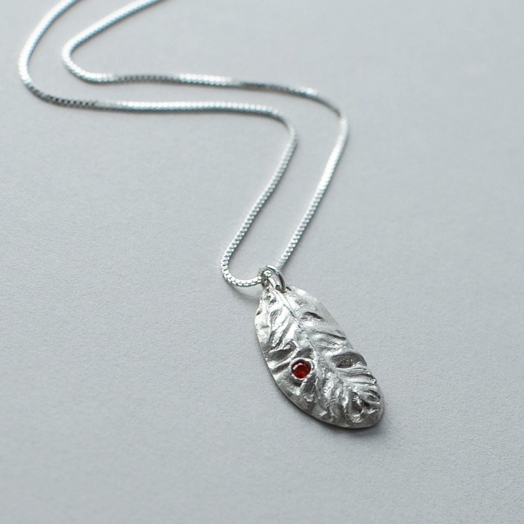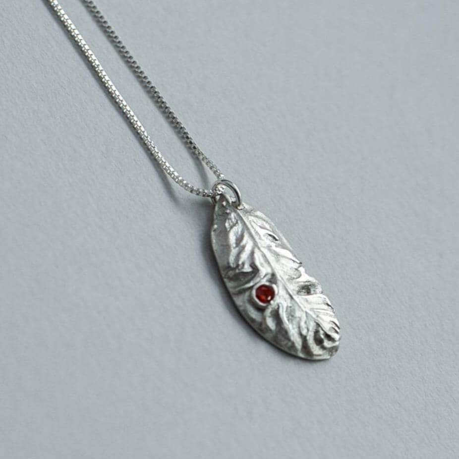 This keepsake necklace features a handcrafted silver feather pendant with a beautiful orange Cubic Zircon stone.
