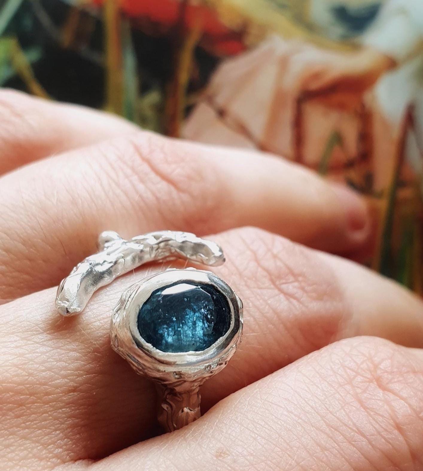 This one-of-a-kind open ring is handmade in solid sterling silver using the ancient lost wax method. One end holds a shimmering teal Kyanite stone, like a drop of deep sea light. The other curves into a delicate mermaid tail, flowing and wild—just like the ocean that inspired it.