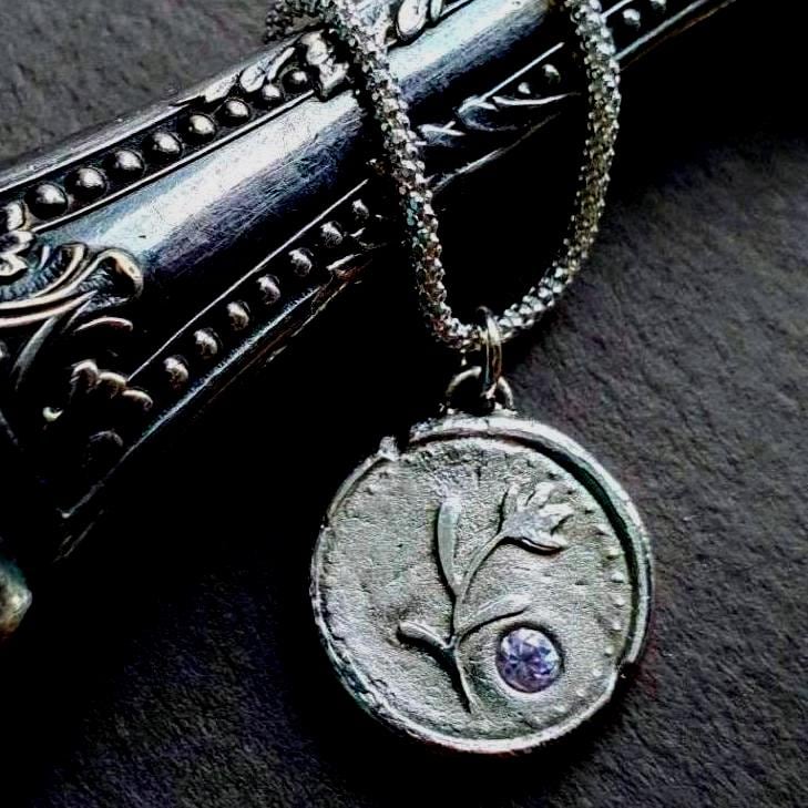 This Silver Flower Pendant Necklace is handcrafted from recycled fine silver and adorned with a light purple cubic zirconia. It carries a quiet charm, vintage-inspired yet modern, symbolizing strength, love and harmony.