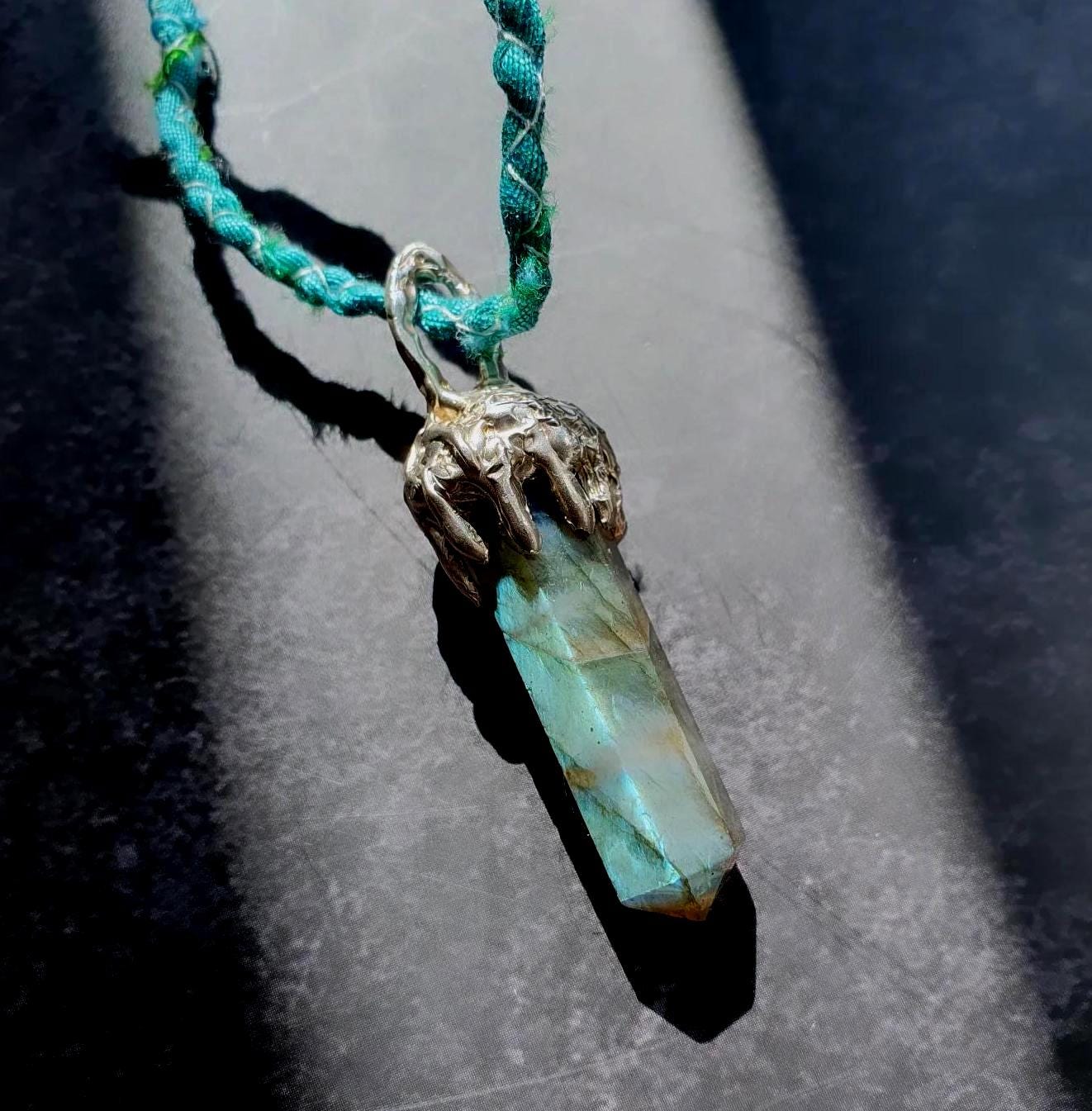 This one-of-a-kind point crystal necklace features flashy Labradorite, 925 sterling silver cap (handcrafted using antique lost wax method) and hand-sewn ribbon.