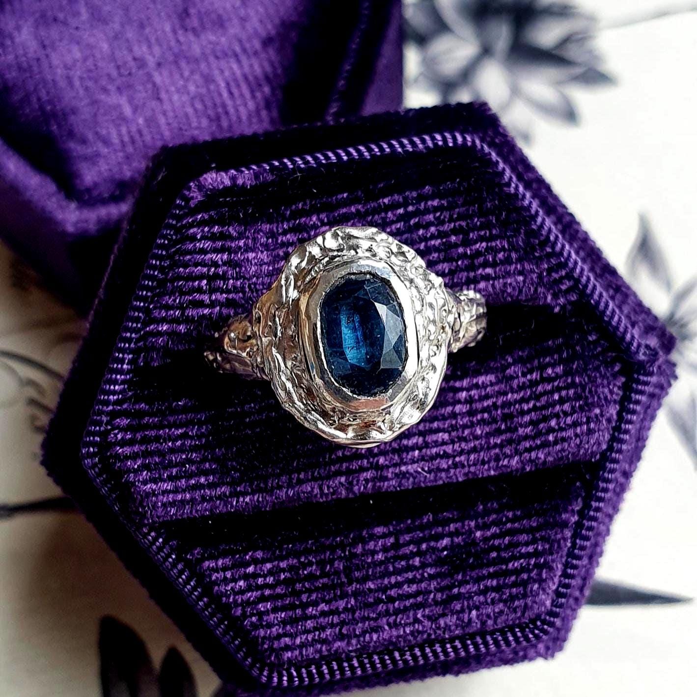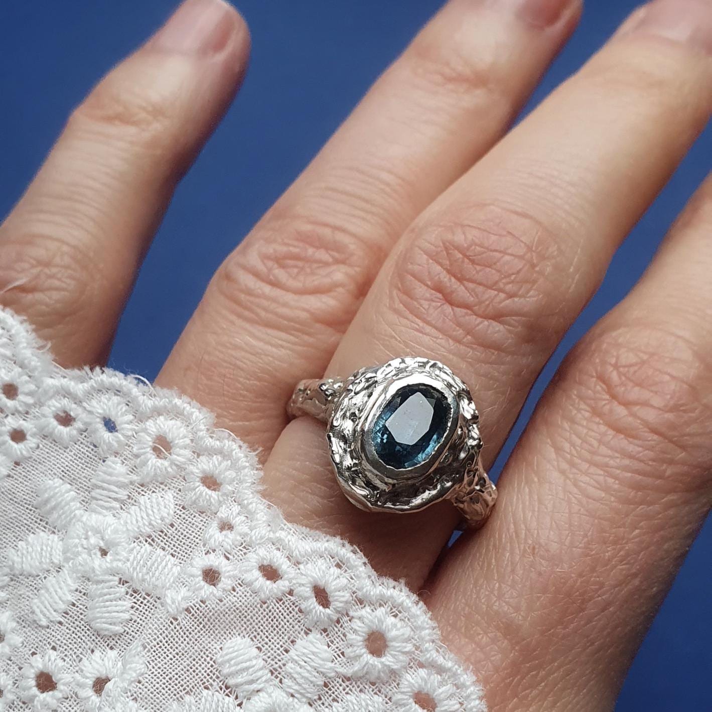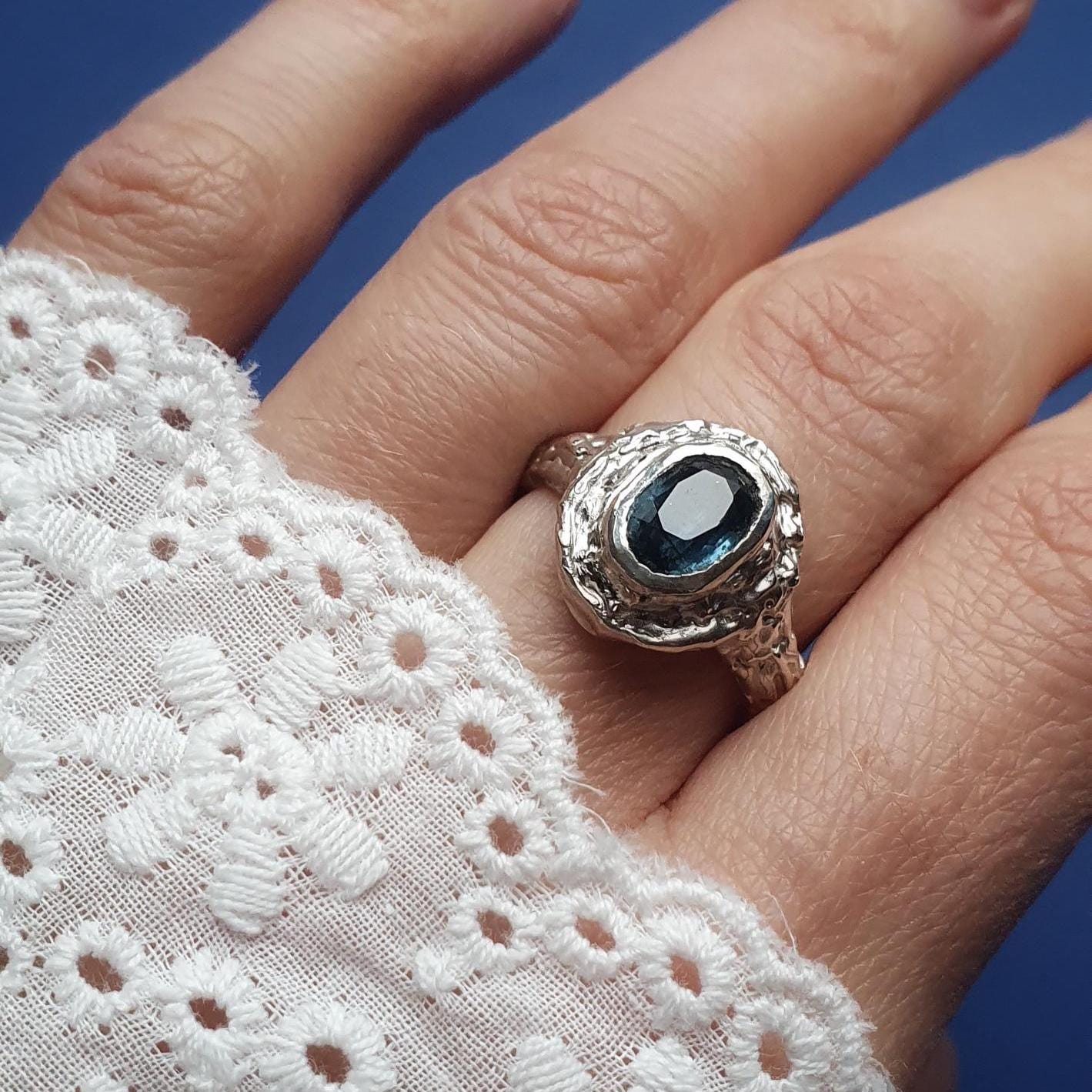 This silver ring is handmade using the ancient lost wax method. Solid sterling silver band with melted metal look and a beautiful blue teal Kyanite stone.
