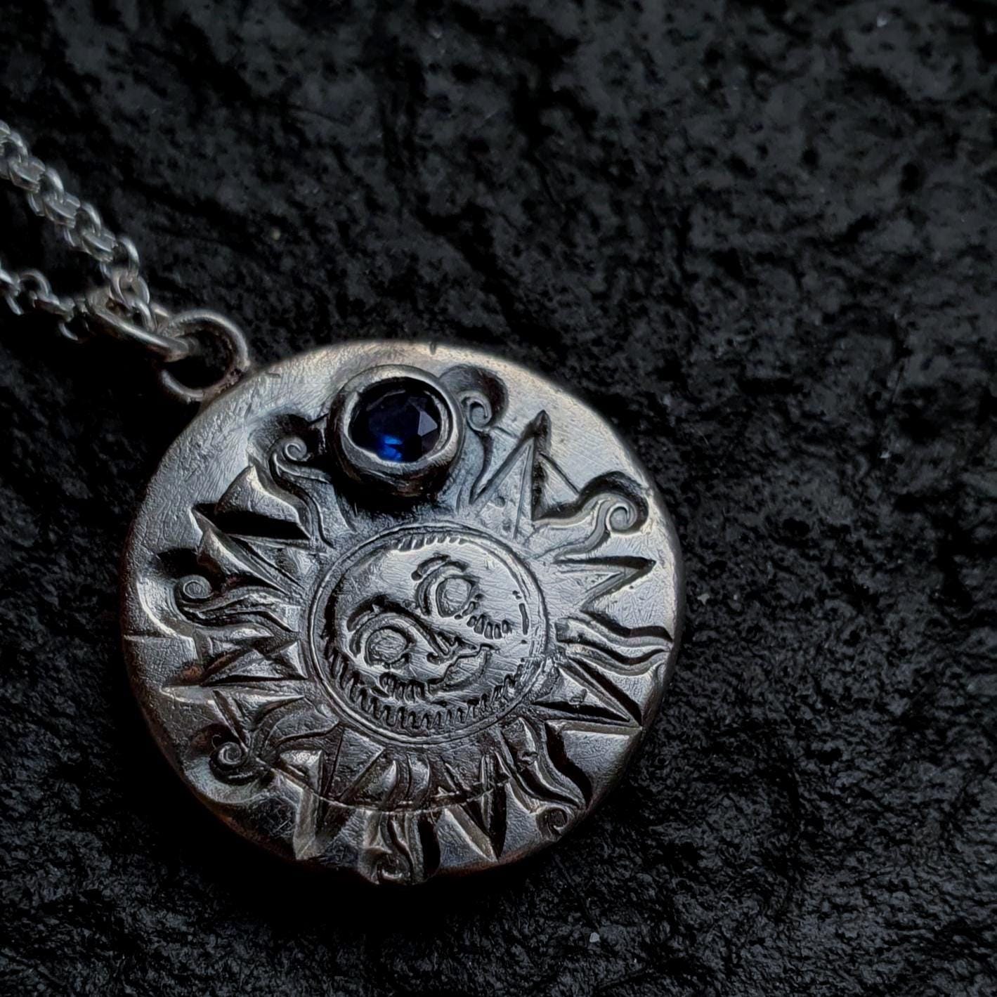 Handcrafted recycled silver sun pendant with blue cubic zirconia. A one-of-a-kind celestial necklace symbolizing light, power, and renewal.