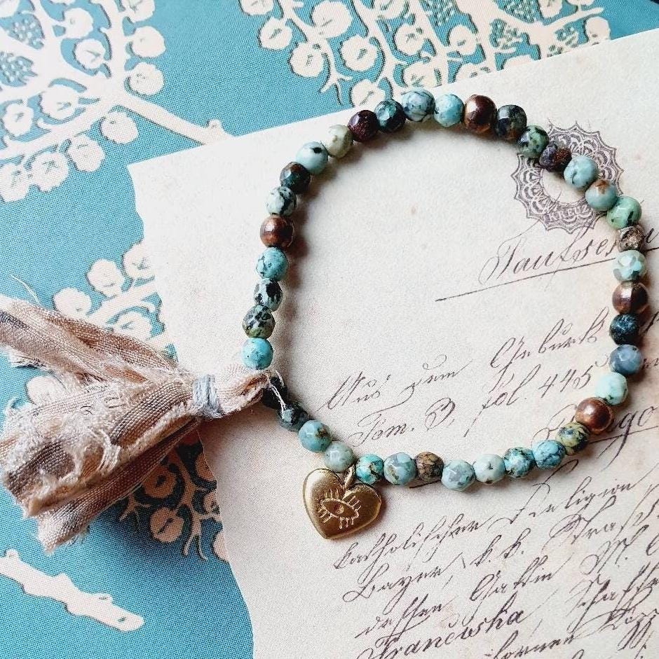 This artisan beaded gemstone bracelet features African Turquoise beads, vintage glass beads, handmade silk tassel and a heart evil eye charm.