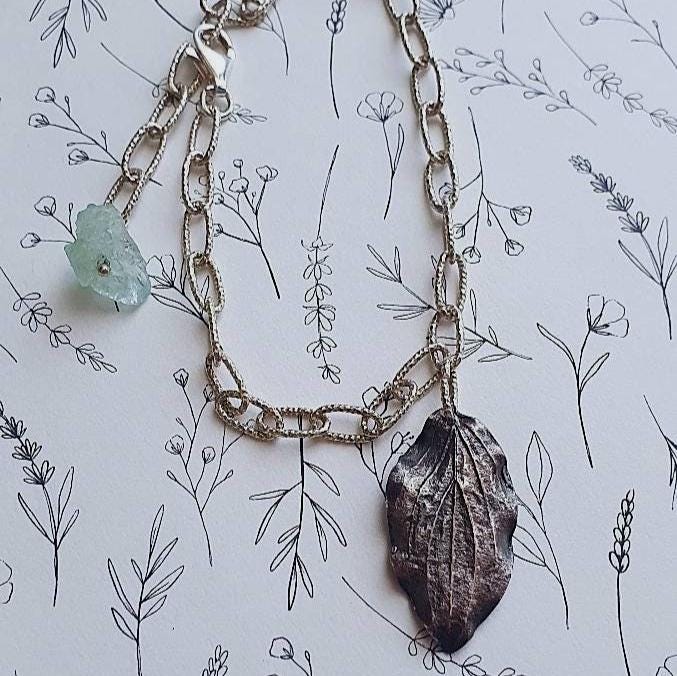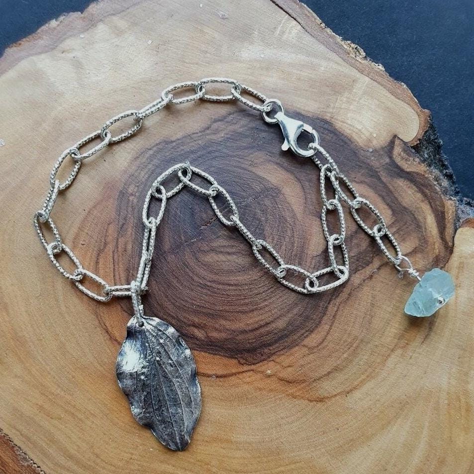This nature inspired silver bracelet features beautiful raw Aquamarine stone, 999. fine silver handcrafted leaf charm and 925. sterling silver chain.