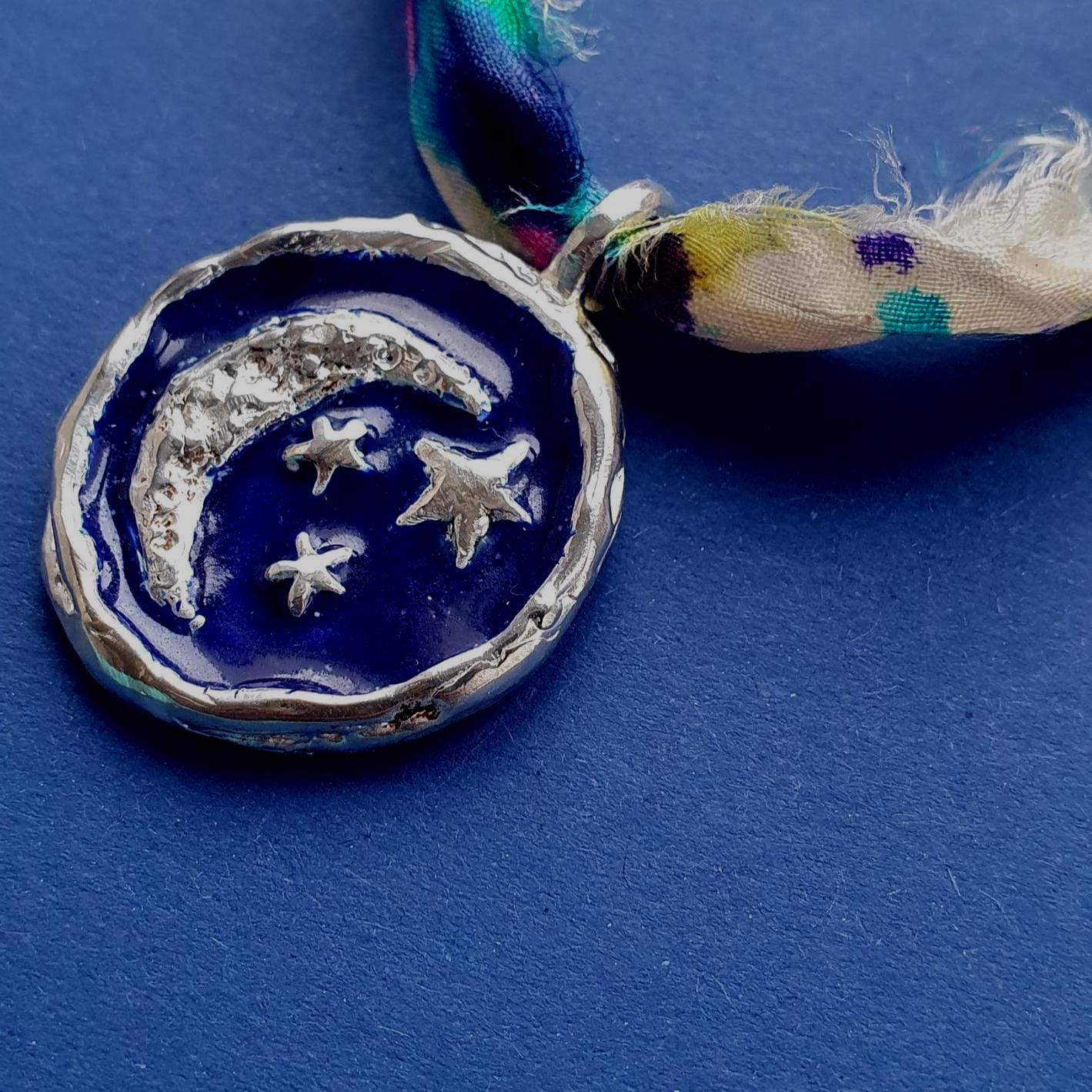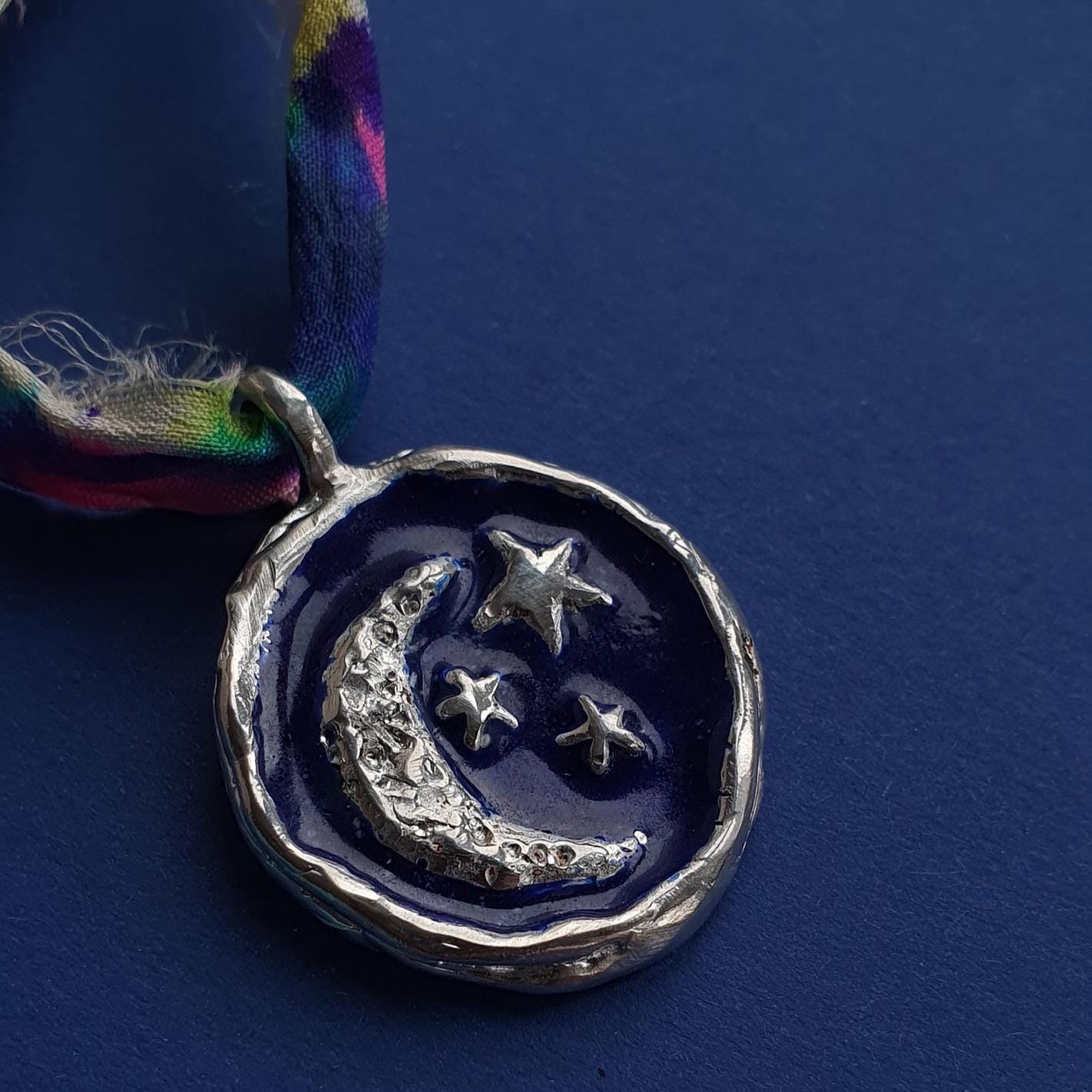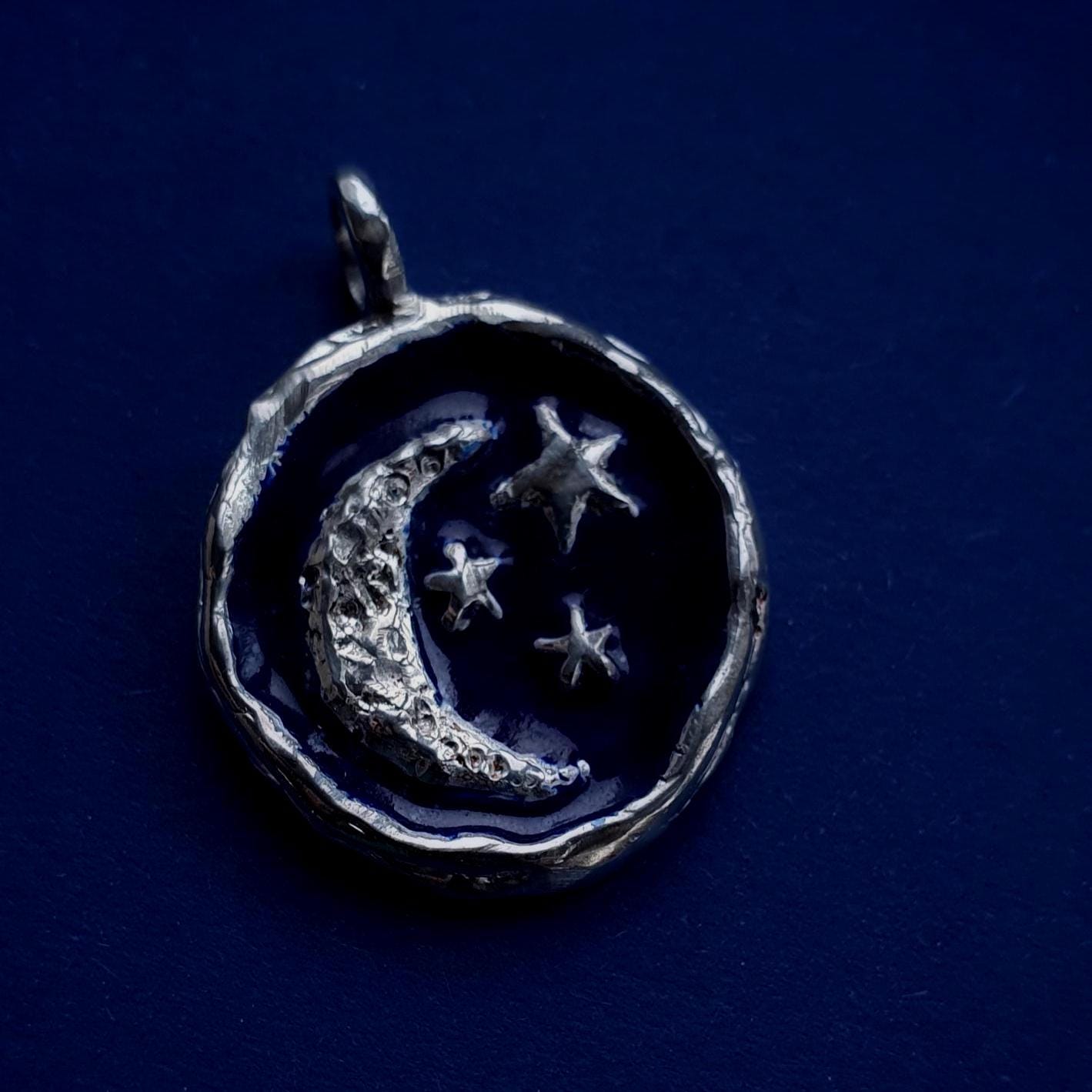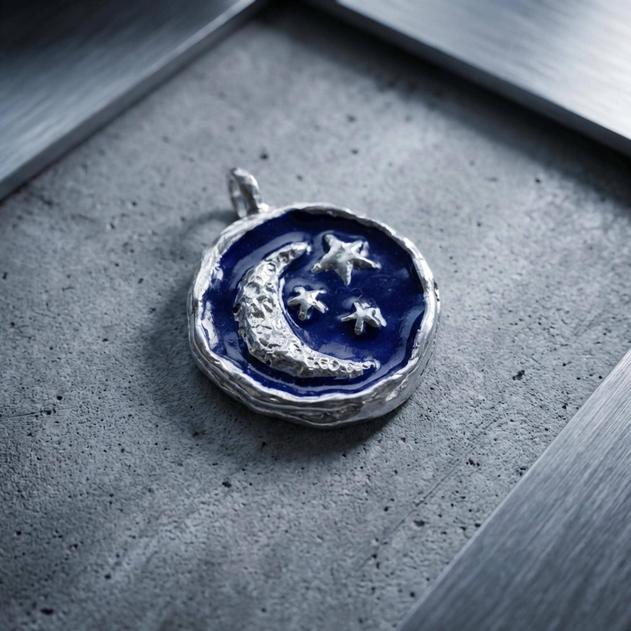 The surface is finished with dark blue hot enamel, inspired by the intensity of a night sky. The rich tone contrasts beautifully with the silver, creating a piece that feels bold and grounded at the same time.