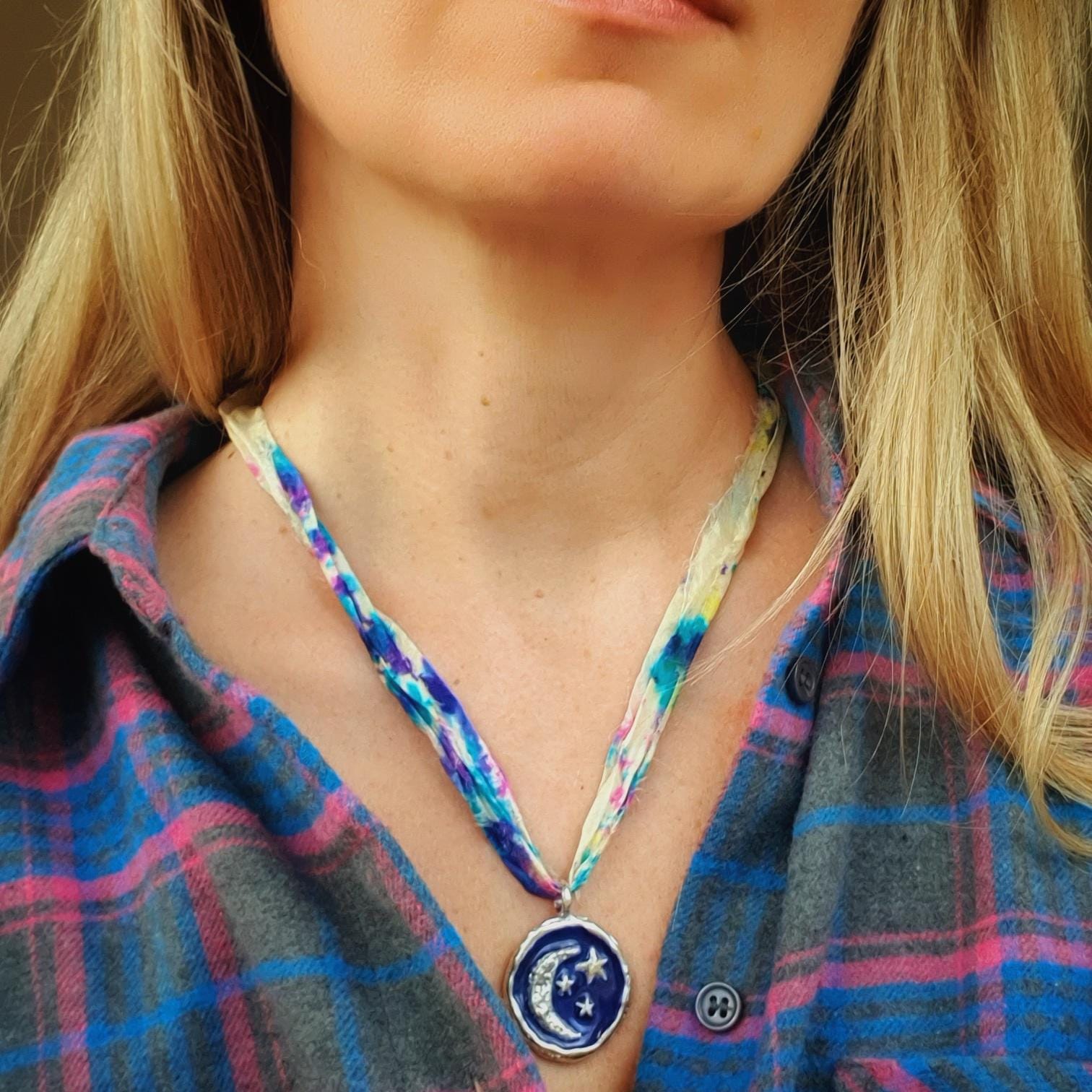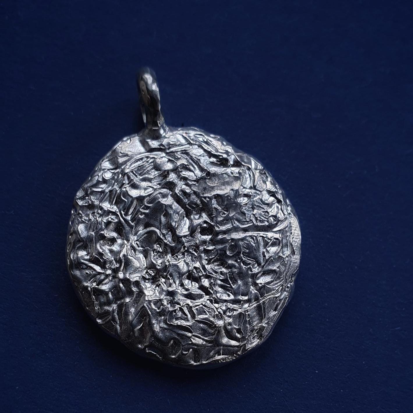 If ordered as a necklace, it comes with a hand-dyed natural silk ribbon that adds softness and contrast to the solid silver. You can also order it as a pendant only.