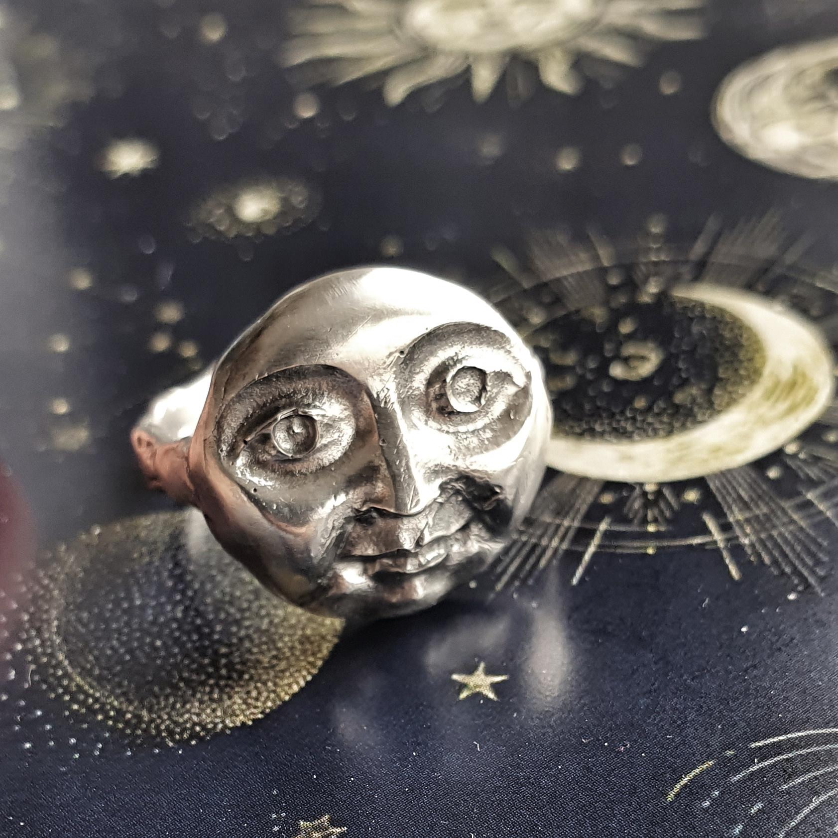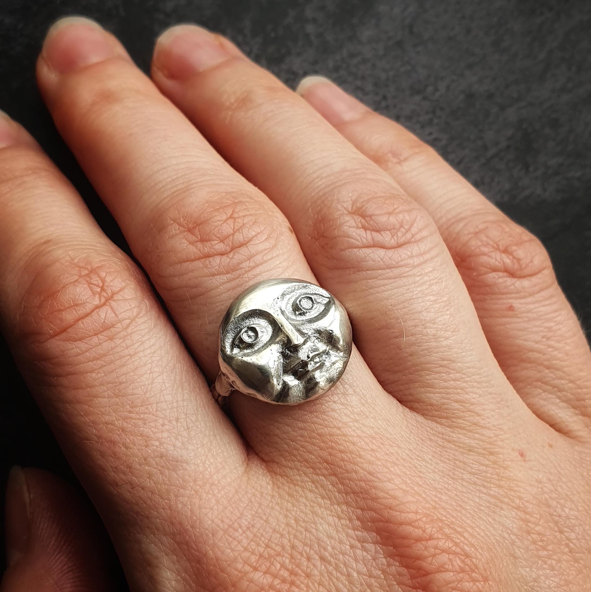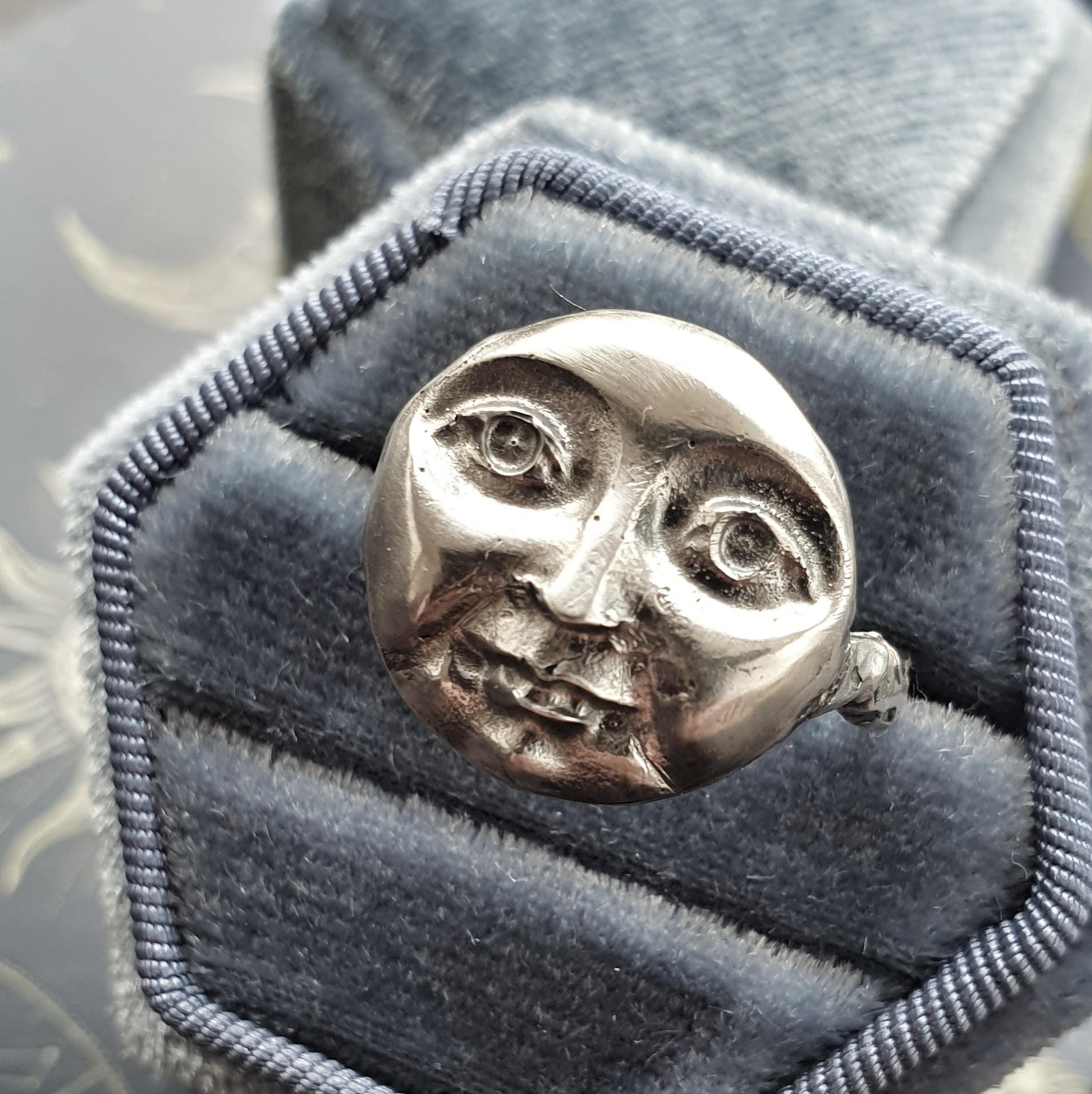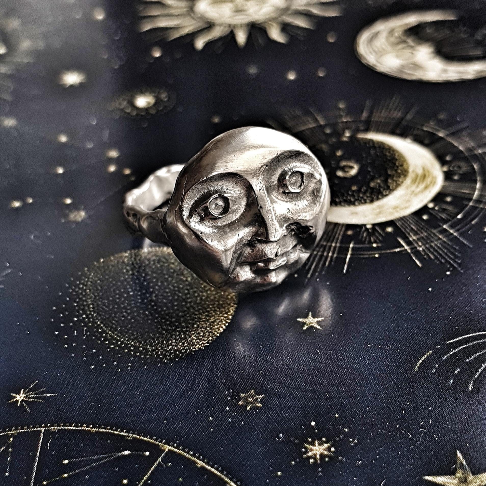 This celestial Luna Moon Ring features a beautiful Moon face on a melted shaped solid Sterling silver band.
