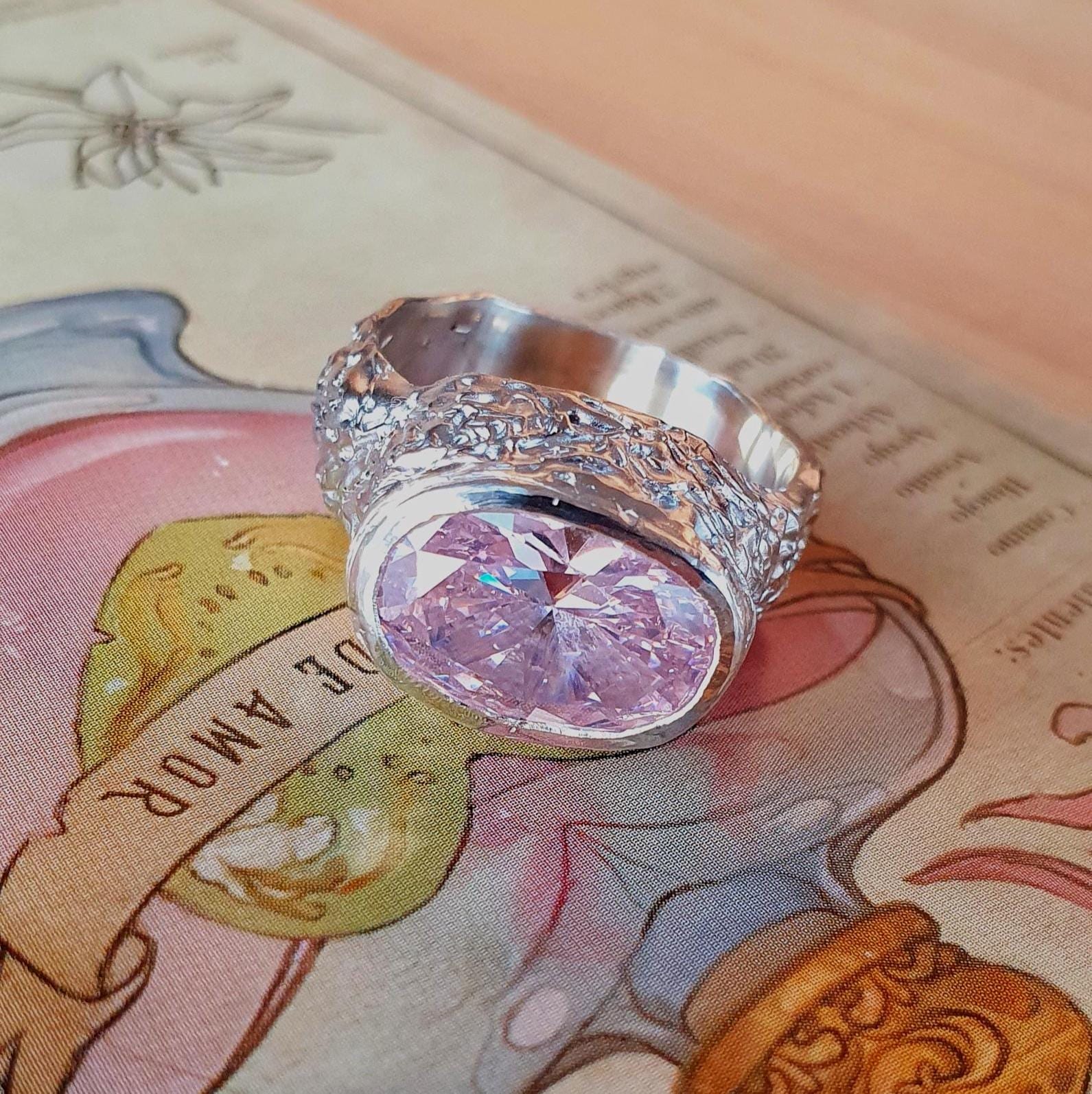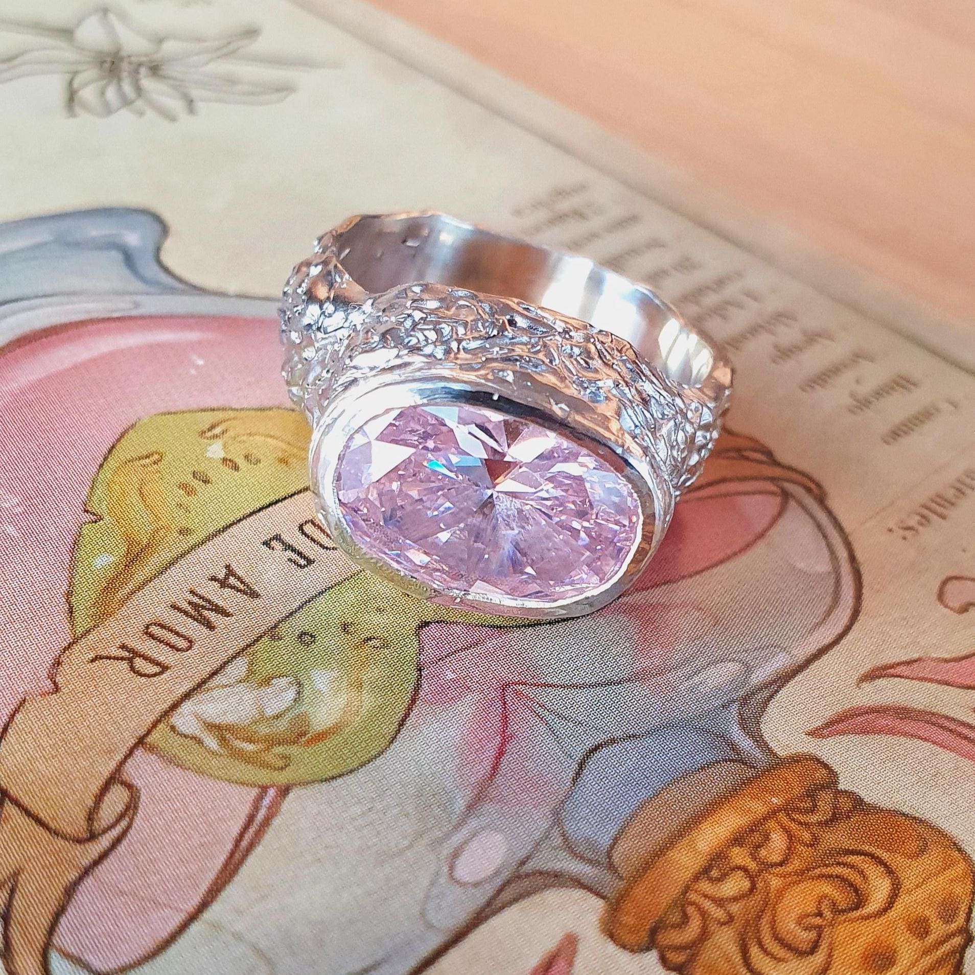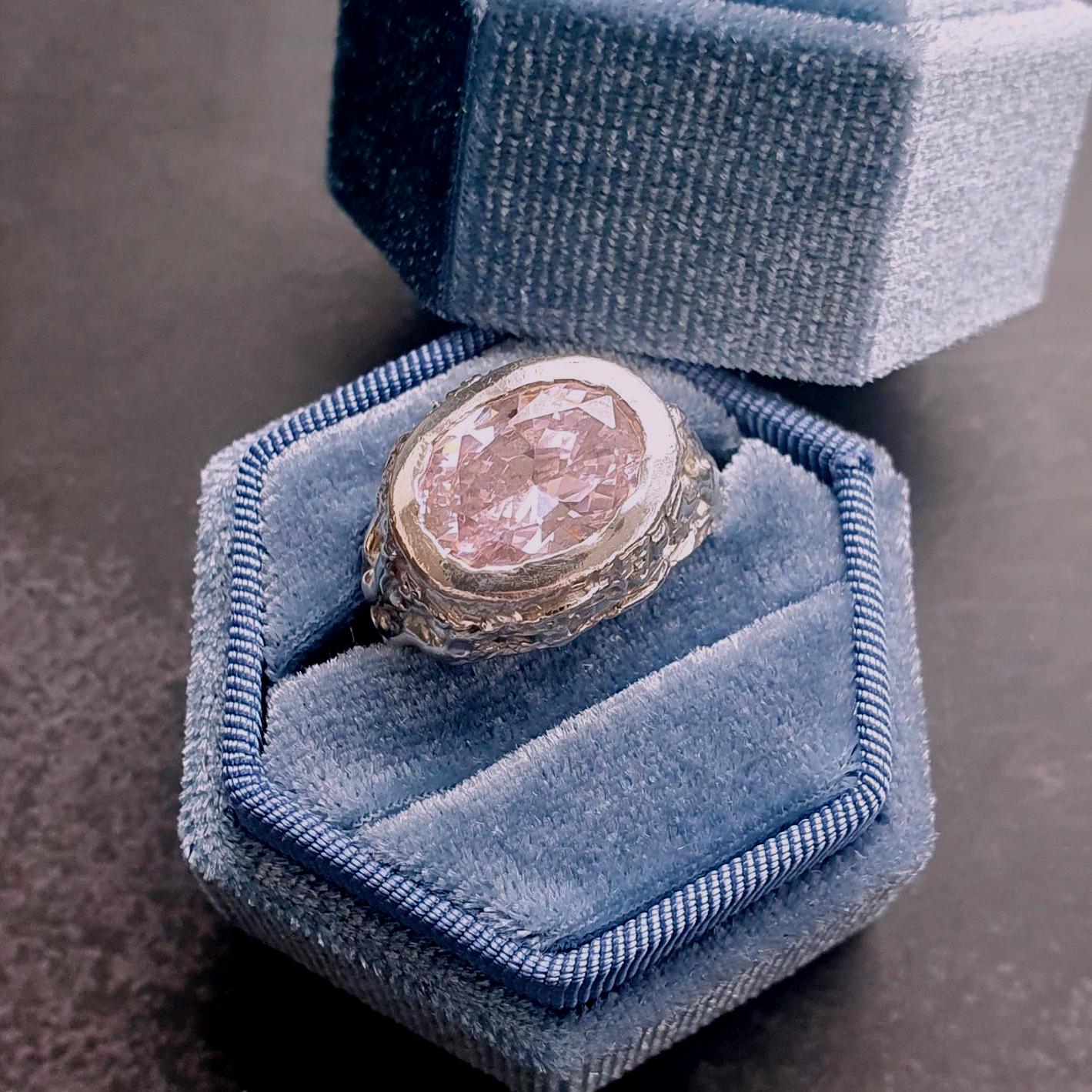Bold pink cubic zirconia signet ring with organic melted silver texture. Handcrafted using lost wax method in Zurich. Made-to-order statement jewelry.