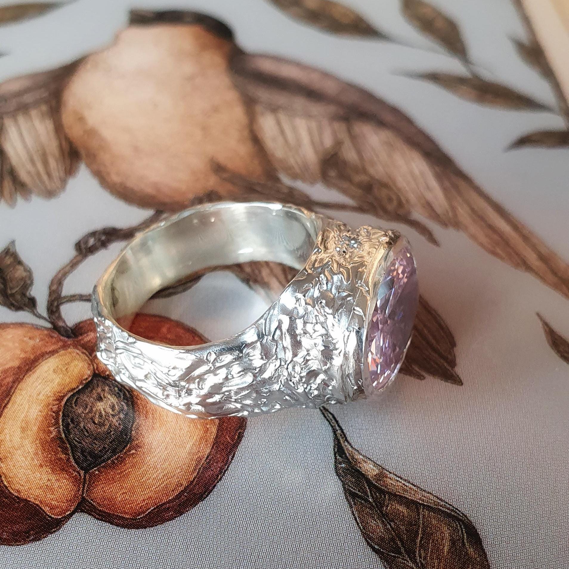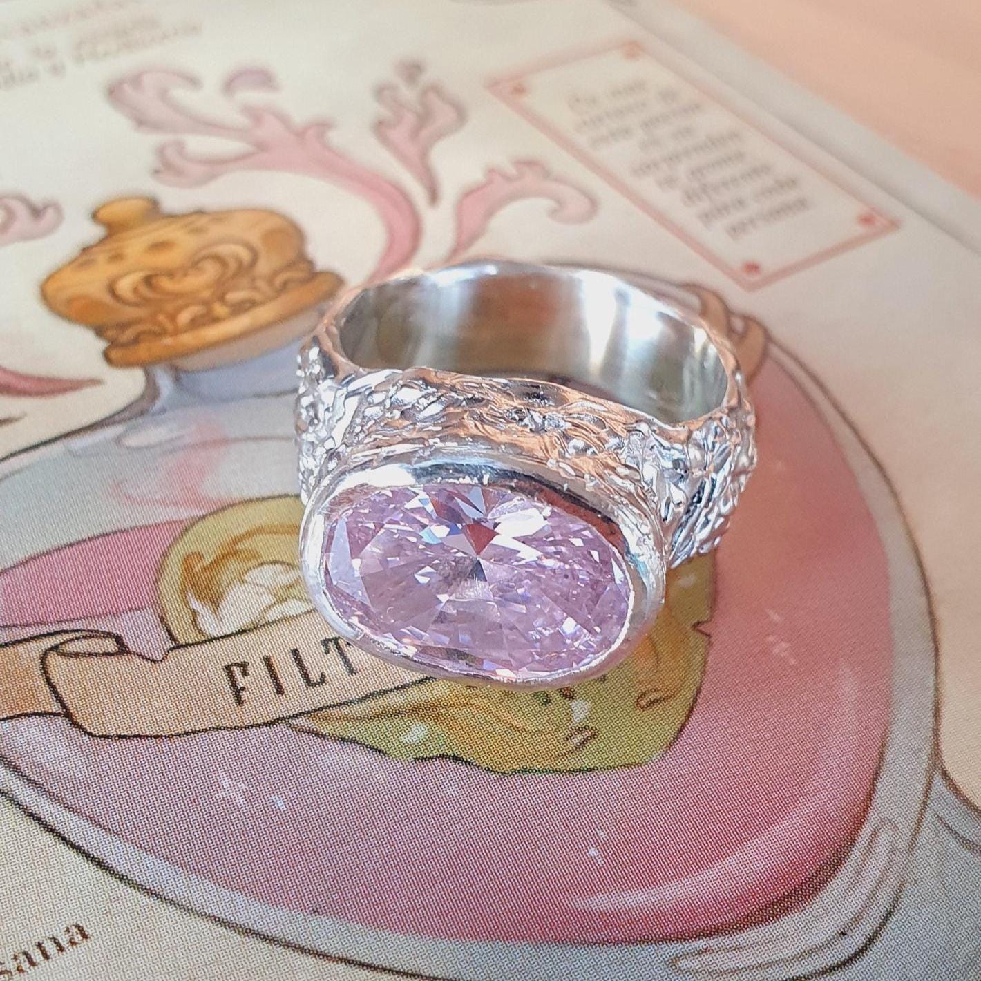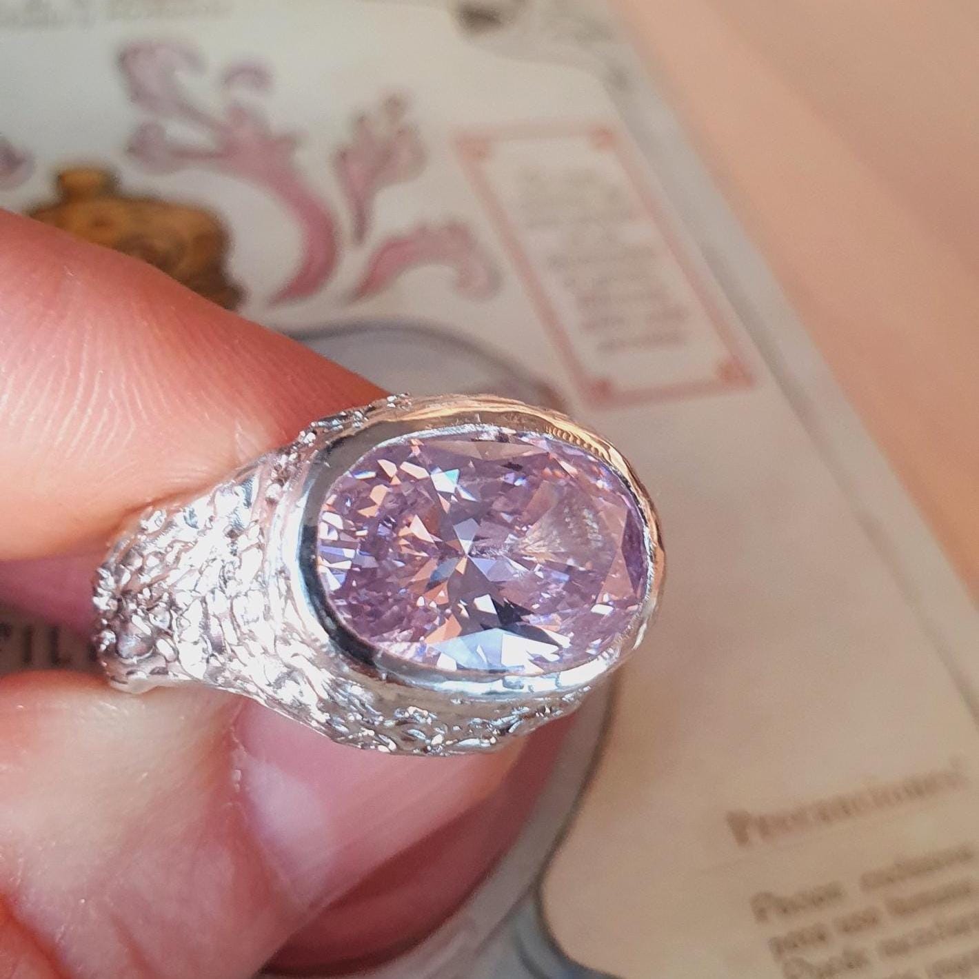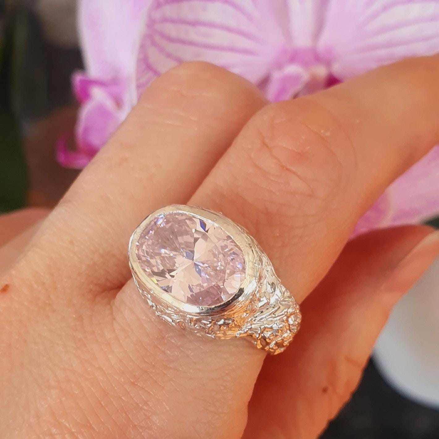 Bold pink cubic zirconia signet ring with organic melted silver texture. Handcrafted using lost wax method in Zurich. Made-to-order statement jewelry.