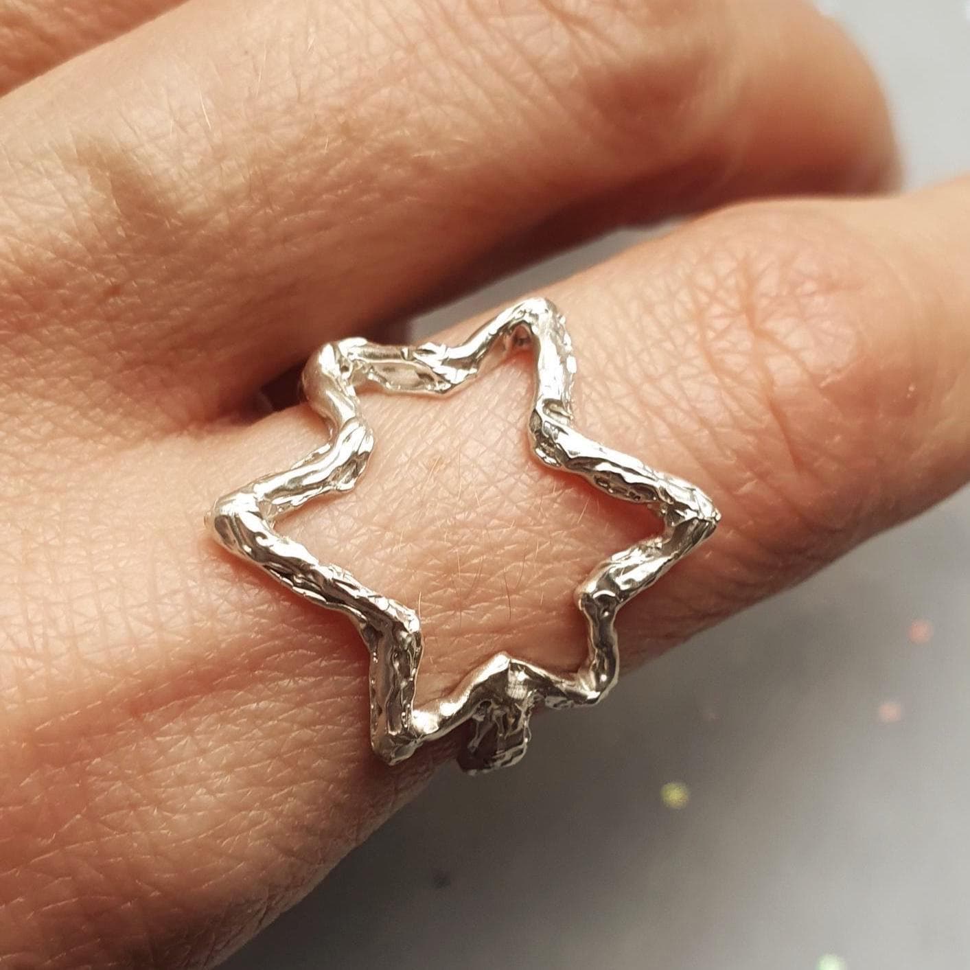 This Star ring is handcrafted in solid sterling silver and features an open star design with a modern melted-metal texture.