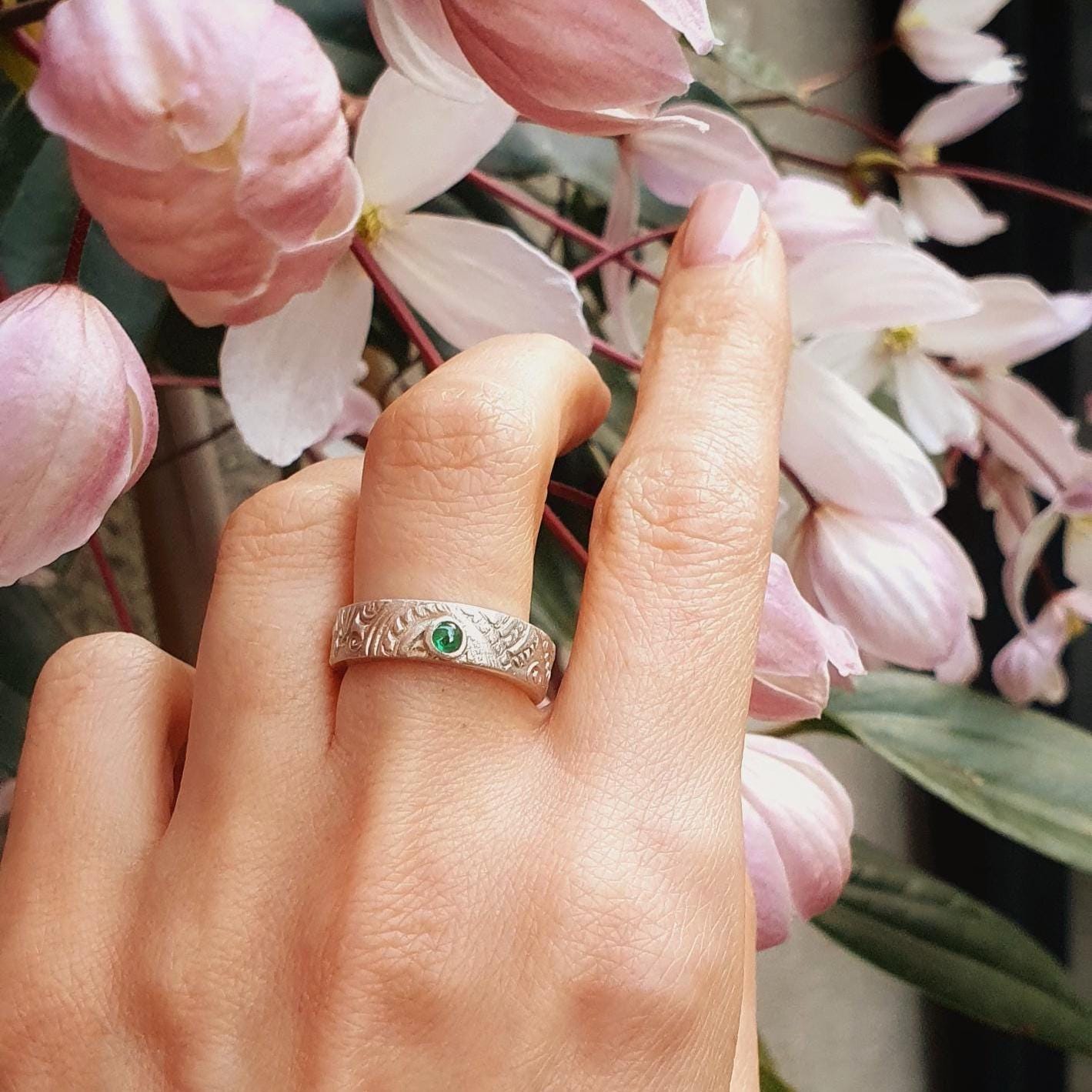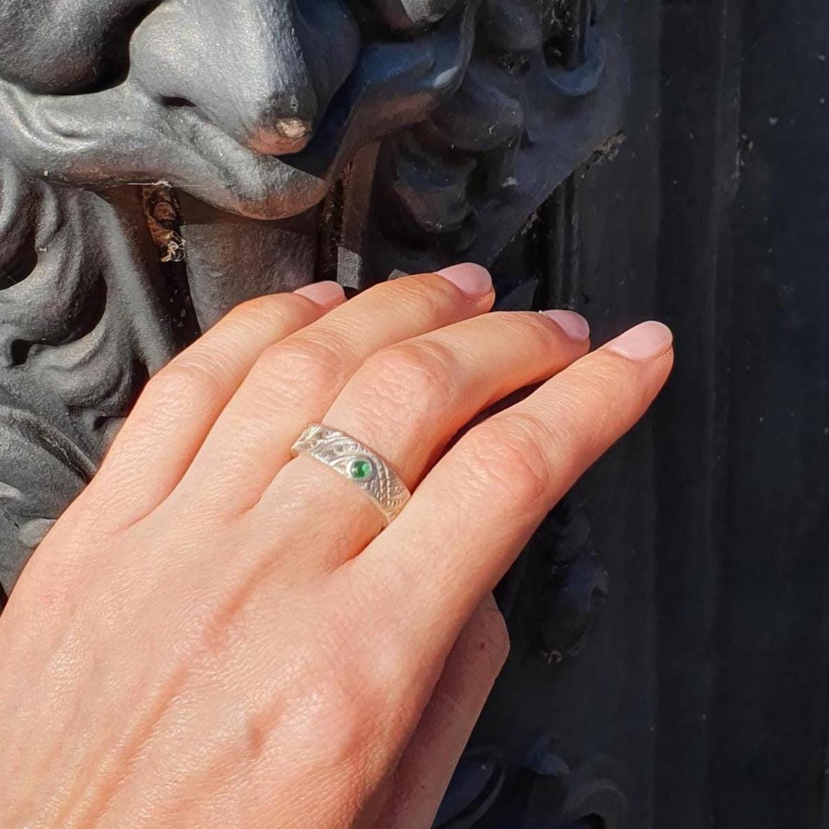 This textured ring is beautifully crafted from recycled silver and adorned with green Cubic Zirconia.