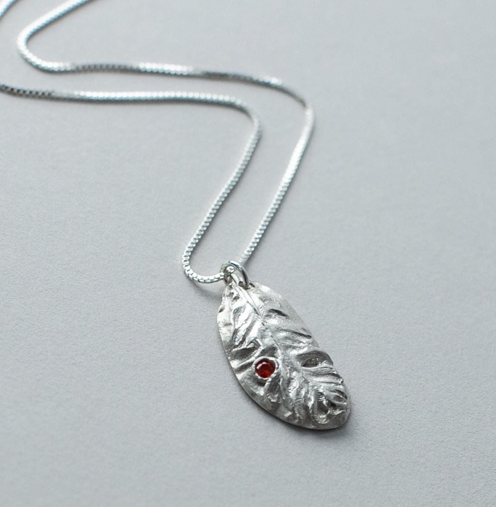 This keepsake necklace features a handcrafted silver feather pendant with a beautiful orange Cubic Zircon stone.