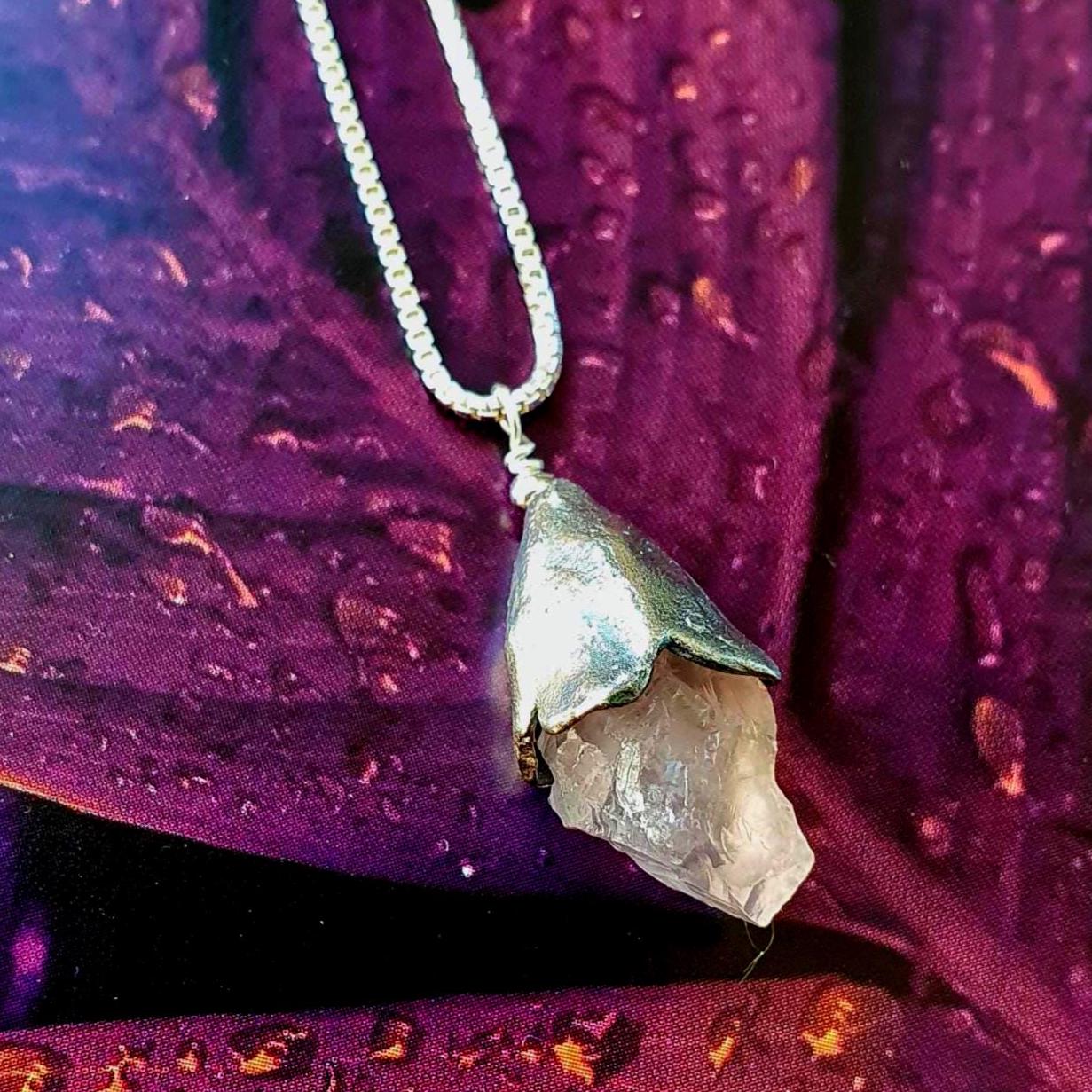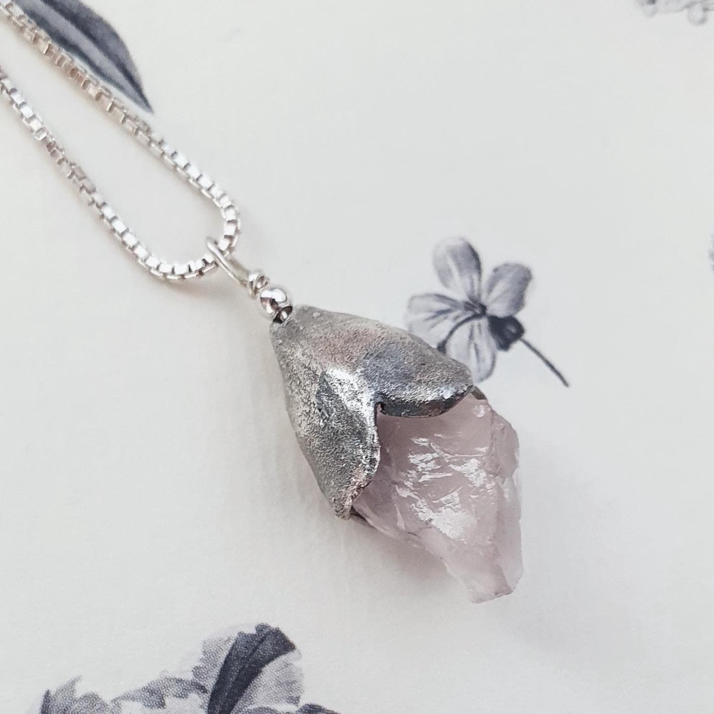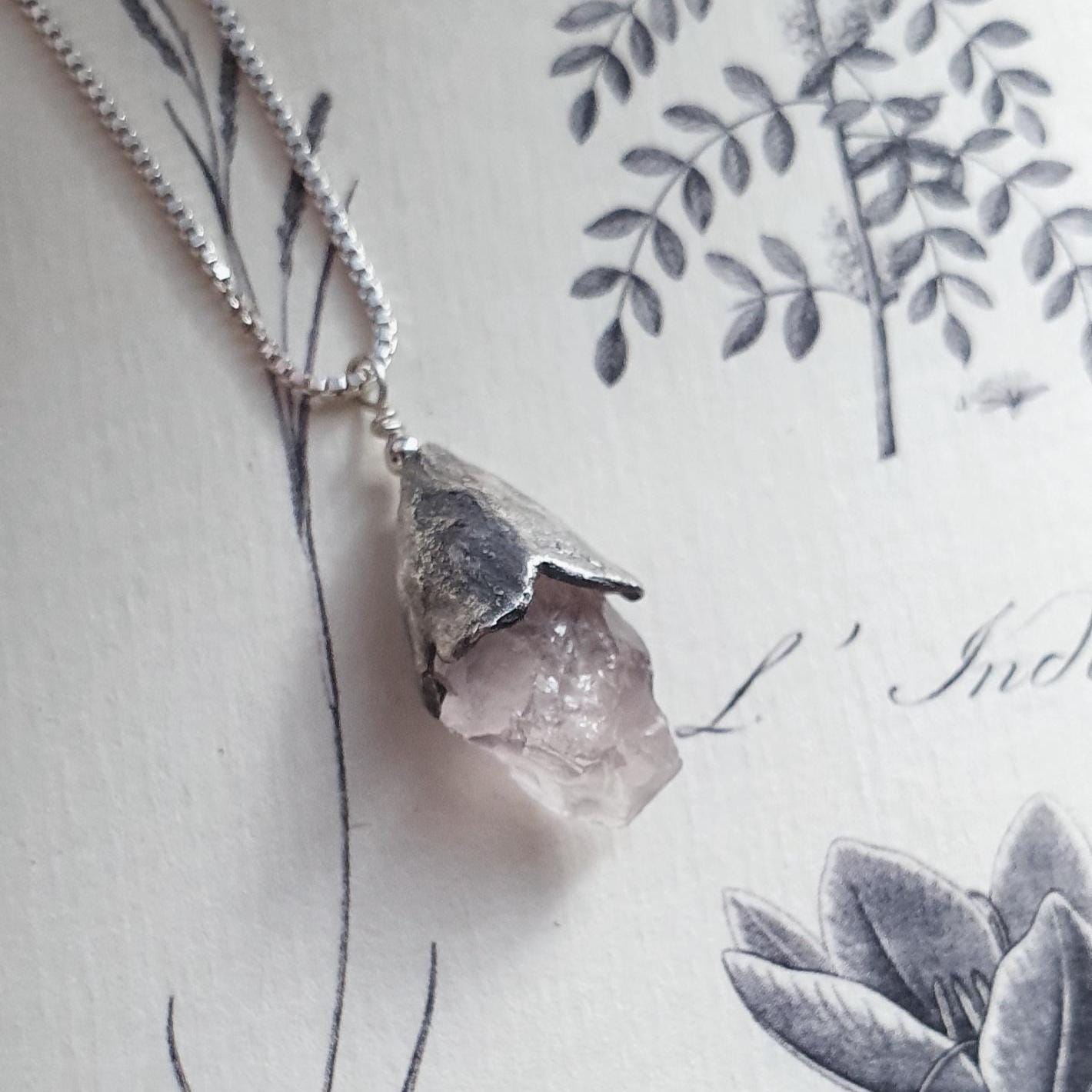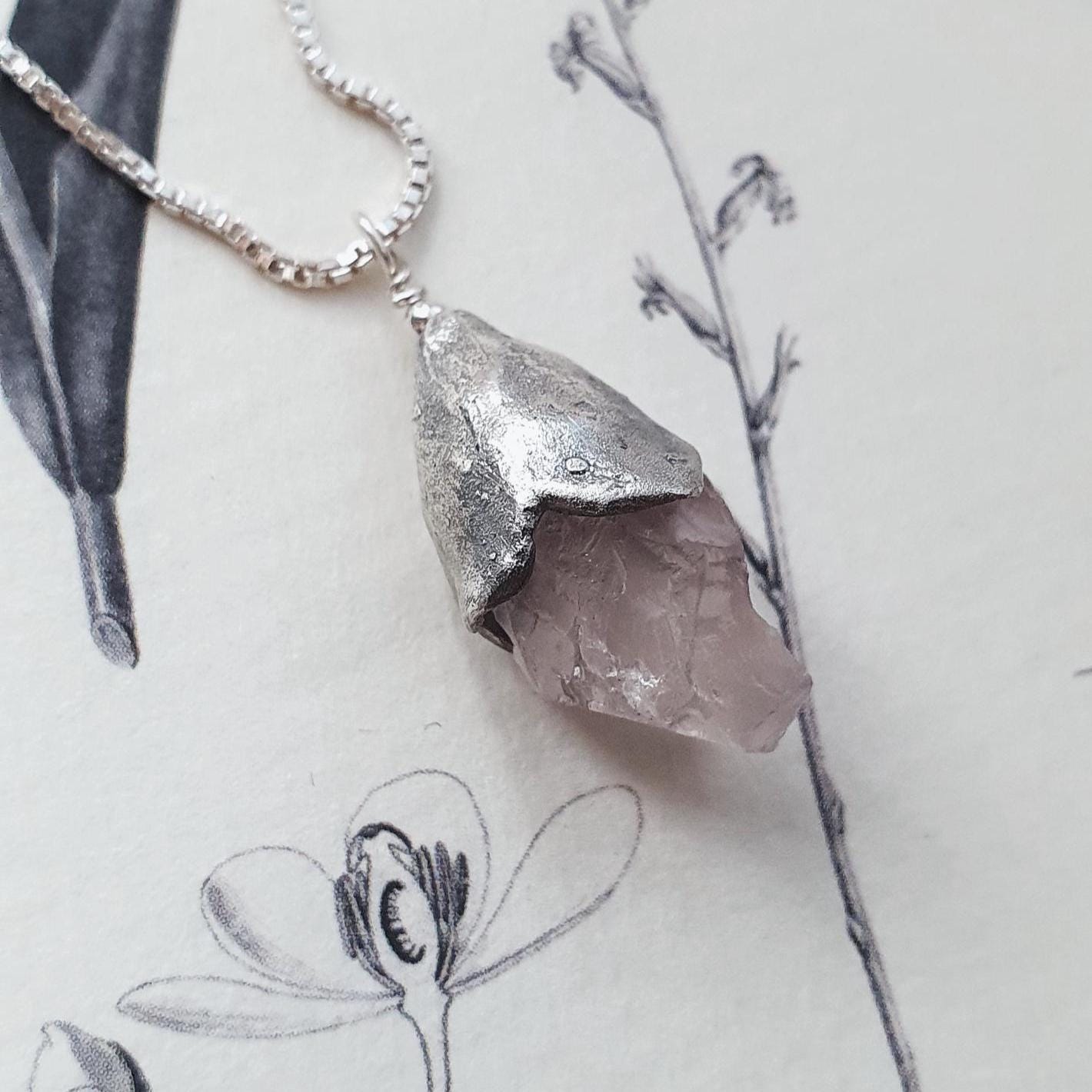 This one-of-a-kind necklace features Raw Pink Quartz in a fine silver flower frame on a sterling silver chain.